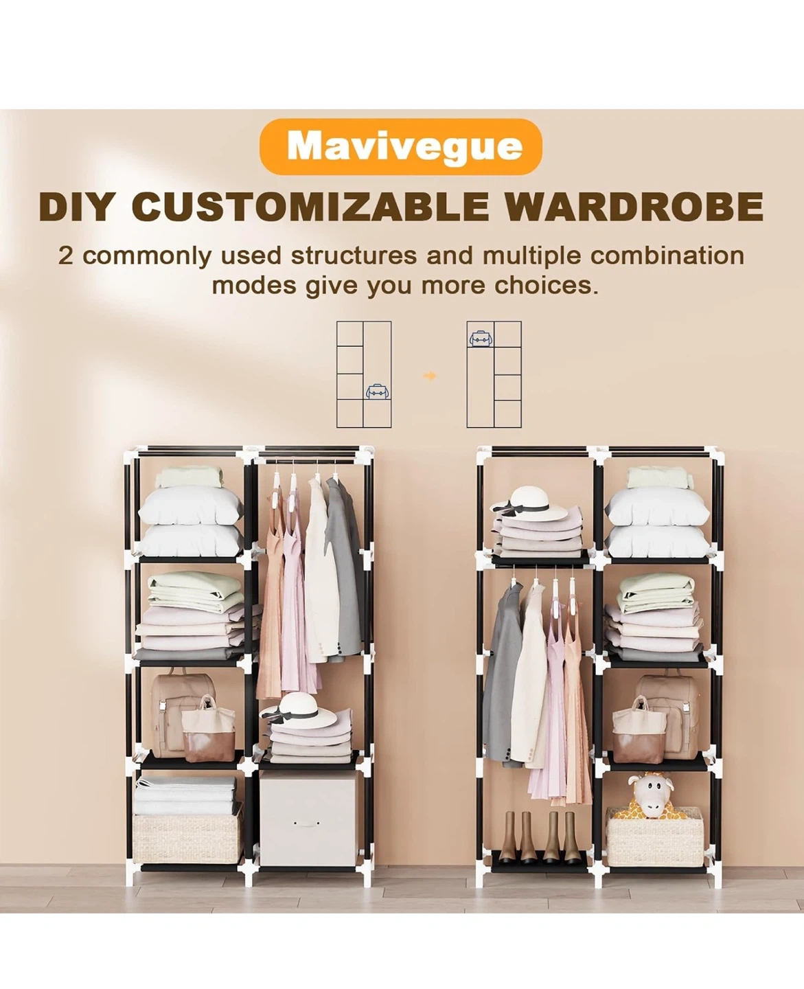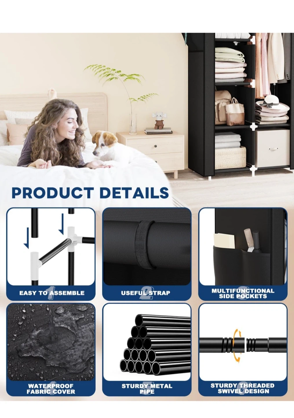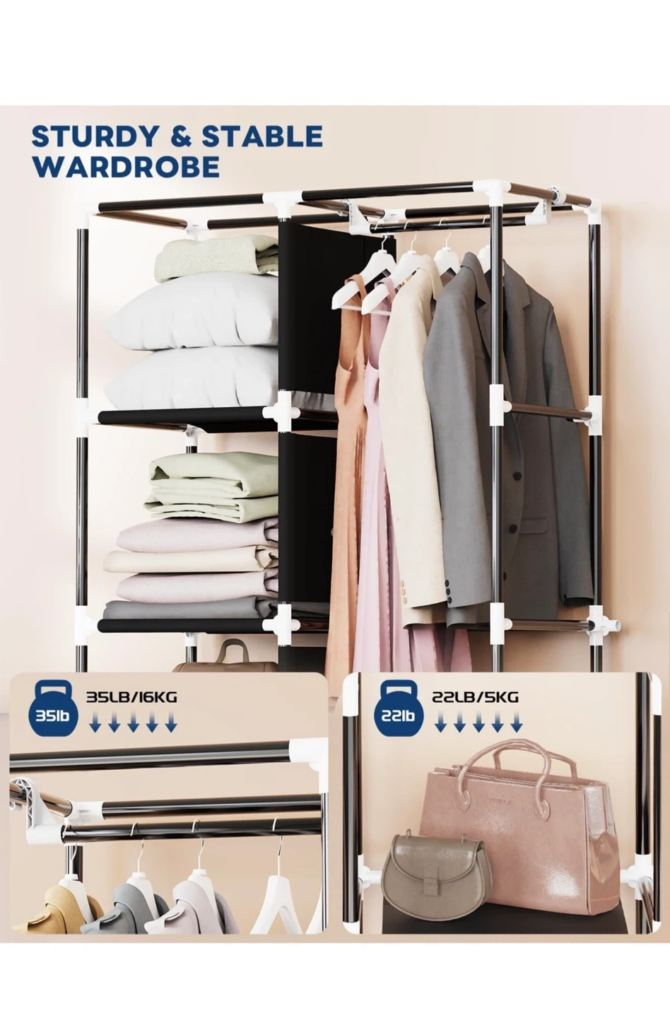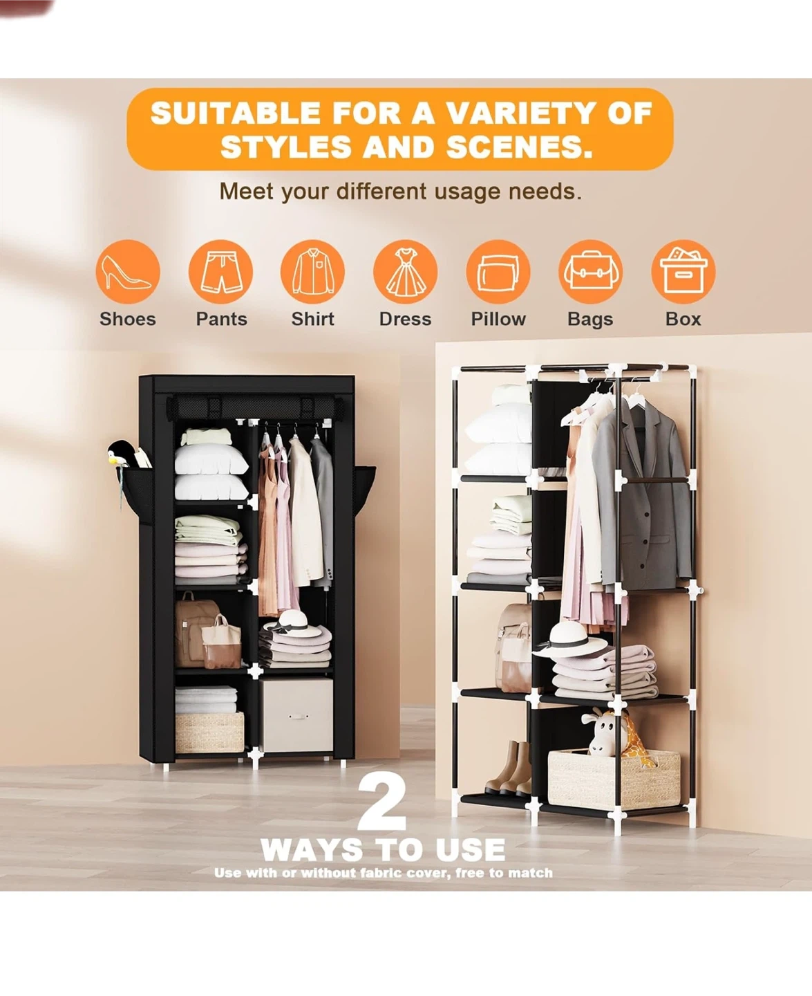 Selling a Mavivegue portable closet in black! It's a great wardrobe organizer for your bedroom. Key features: - Non-woven fabric cover - Clothes storage organizer - Dimensions: 16cm/63.4" height, 45cm/17.7" depth, 86cm/33.8" width - Sturdy metal pipe - Waterproof fabric cover - Multifunctional side pockets