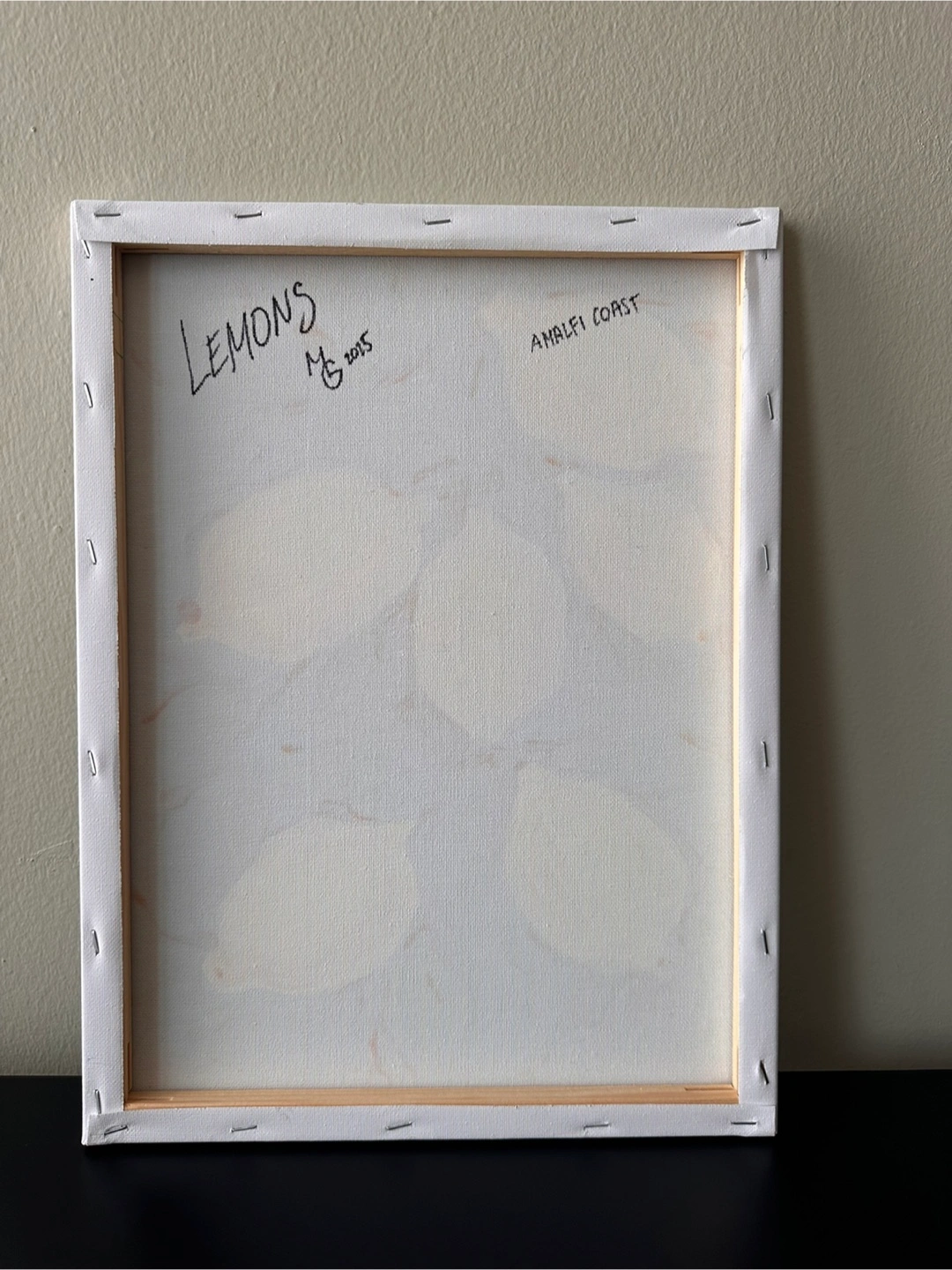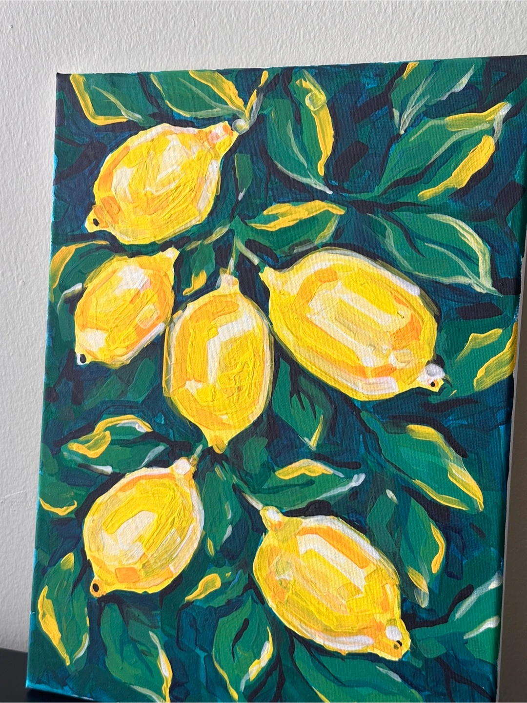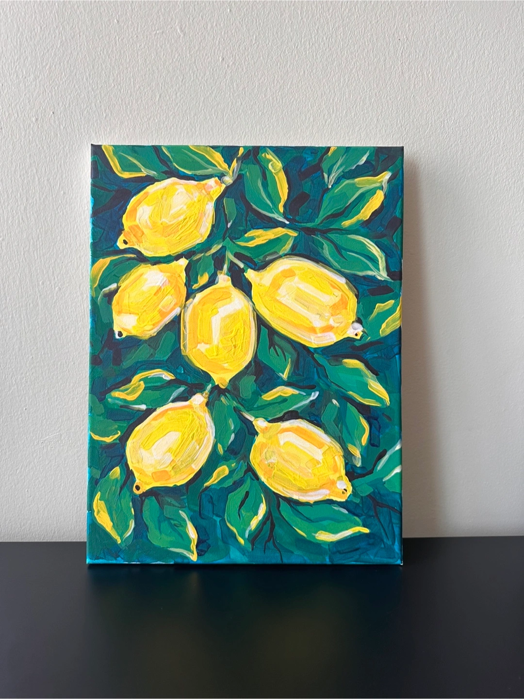 A vibrant painting of lemons on canvas, perfect for adding a touch of sunshine to any room! The artwork features bright yellow lemons nestled among lush green leaves against a dark blue background. It represent Italian style of the lemon trees. Acrylic material on canvas. Dimensions: 12 x 16 inches Pick up near Yonge and Bloor