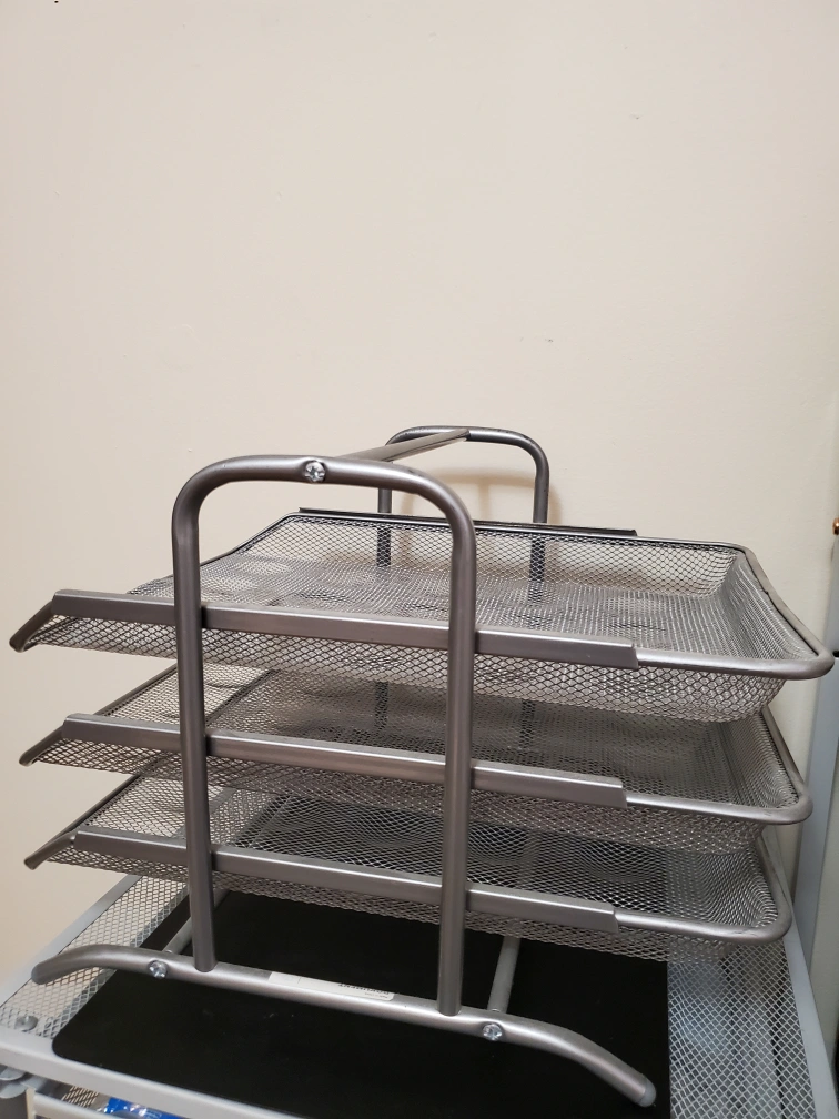 I have a mesh desk organizer for sale! It has three tiers, perfect for organizing papers or other items on your desk. It's in great condition and ready to help you declutter your workspace