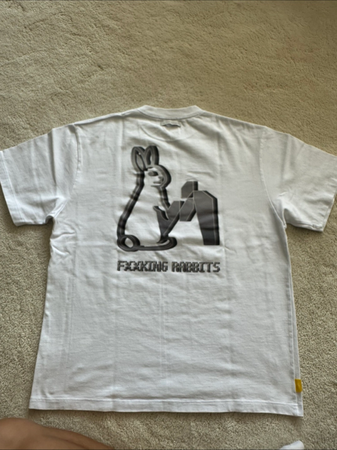 Selling a white FR2 (Fucking Rabbits) T-shirt. The length is 29 inches and the width is 23.5 inches. It features the FR2 logo on the front and a rabbit design on the back. Great condition!