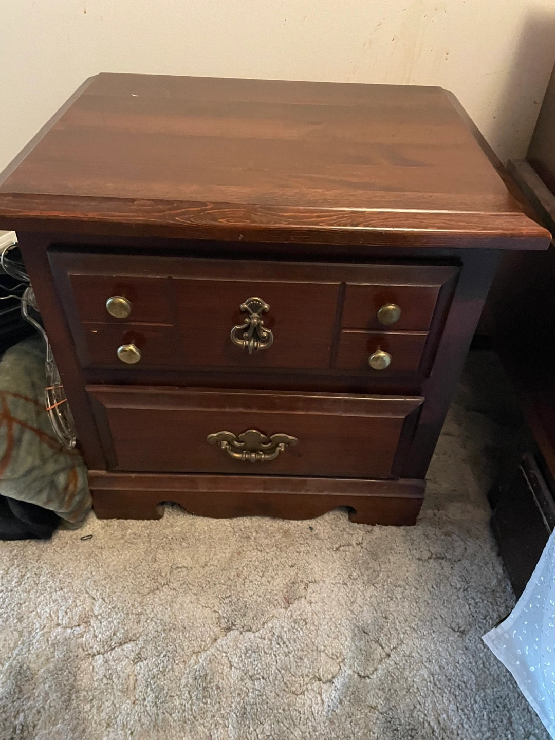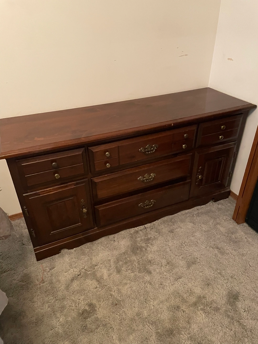 Selling a matching dark brown wood dresser and nightstand set. Both pieces feature multiple drawers and cabinet space for storage. The dresser is long and wide, while the nightstand is a smaller square shape. The set shows some signs of wear but is still in good condition for use dresser has couple scratch on the top cash only please no e-transfers thank you