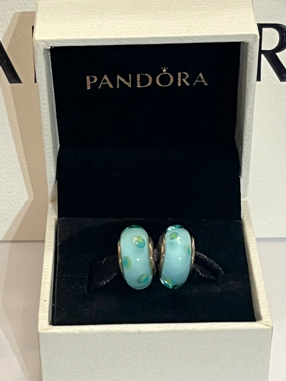 Set of 2 P💎ndora Murano Charms Can provide the box and gift bag if giving as a gift just let me know in advance . Pick up around Kingston Road and Mccowan evenings and weekends or in certain areas along the Bloor Danforth Subway Line weekdays. Let me know what area or intersection in Toronto you are coming from and I can let you know the closest pick up spot.