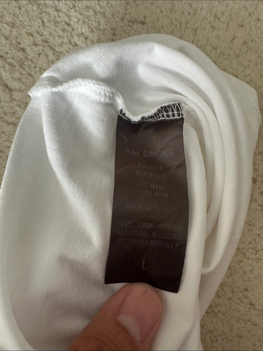 Selling a Raf Simons T-shirt in size L. The shirt features a graphic print and is made from 100% cotton. Measurements: - Length: 28 inches - Width: 23 inches