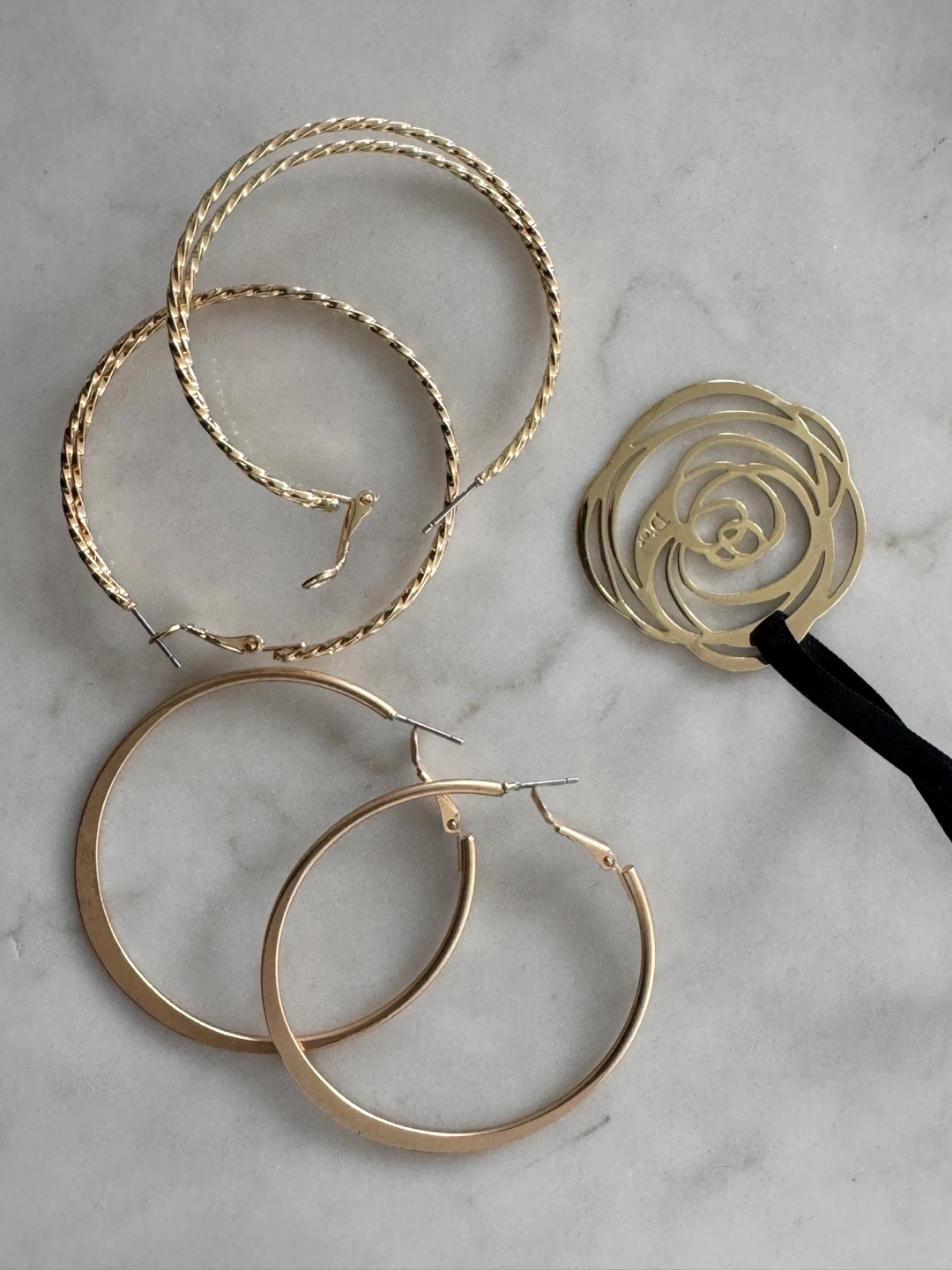 Selling a Dior hair tie with a gold rose design and a set of gold hoop earrings. The earrings come in two styles: twisted and smooth. They are in great condition and ready for a new home! 1 for $4