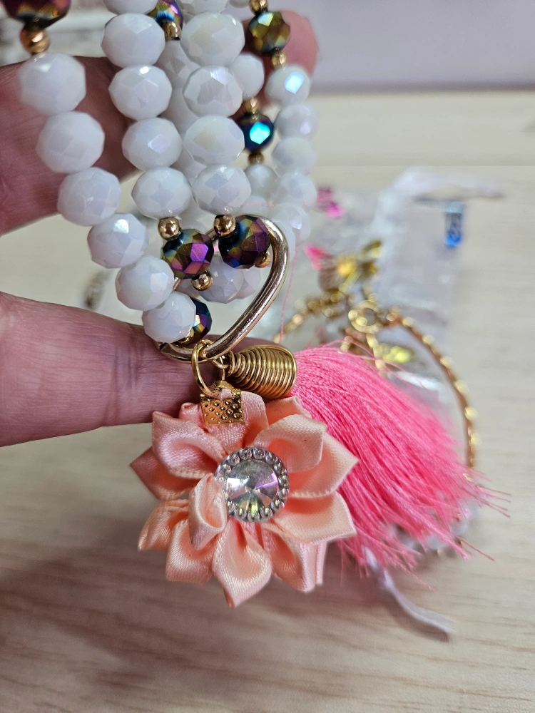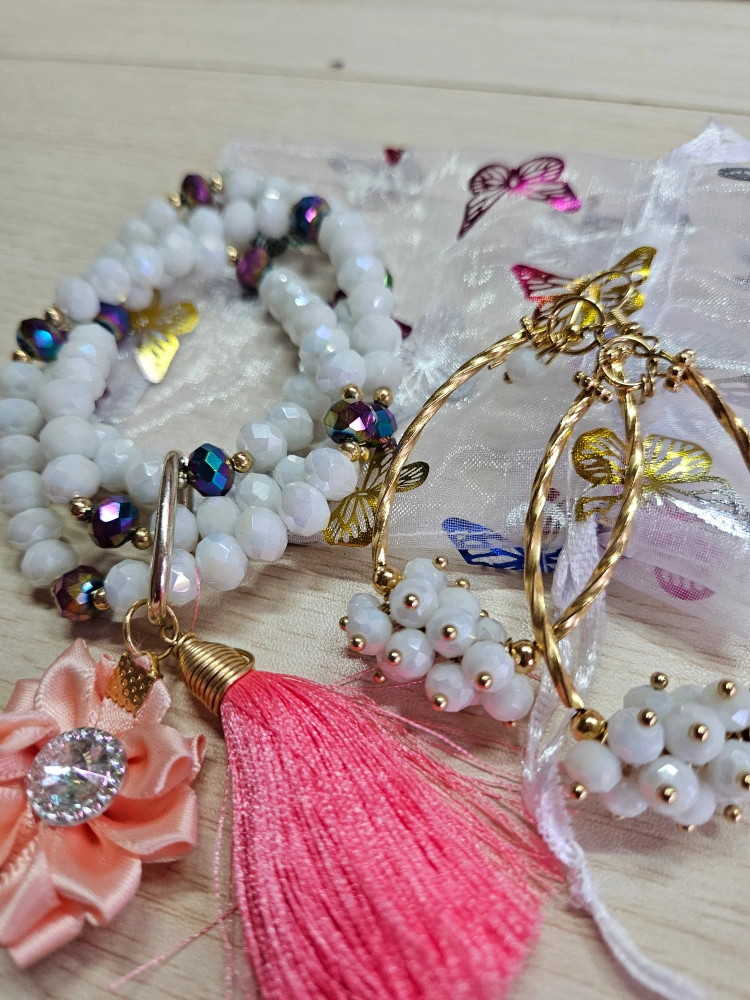 Selling a beautiful handmade beaded bracelet and earrings set. The bracelet features white beads with iridescent accents and a pink tassel. The earrings are gold hoops with matching white bead clusters. Perfect for adding a touch of elegance to any outfit!
