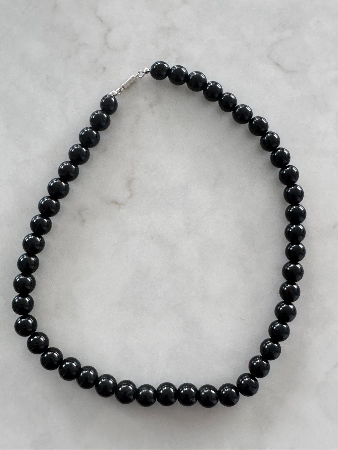 Here's a simple and elegant black obsidian necklace! It's in great condition and ready to add a touch of class to any outfit. Perfect for everyday wear or dressing up for a special occasion