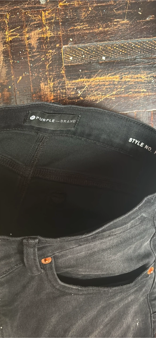 Selling a pair of Purple Brand distressed black jeans. They feature a cotton and lycra blend with a leather patch. The jeans have a unique distressed look with paint splatter details. Perfect for a stylish, edgy look!