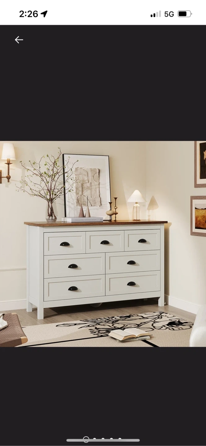 Wayfare Price $$336 Looking to sell a lovely white dresser with a wooden top! It features seven drawers with black handles. - Dimensions: 47.2" wide, 31.5" tall, and 15.7" deep - Each drawer is about 21.3" wide, 12.4" deep, and 7.7" tall - It also comes with an anti-tipping device for safety