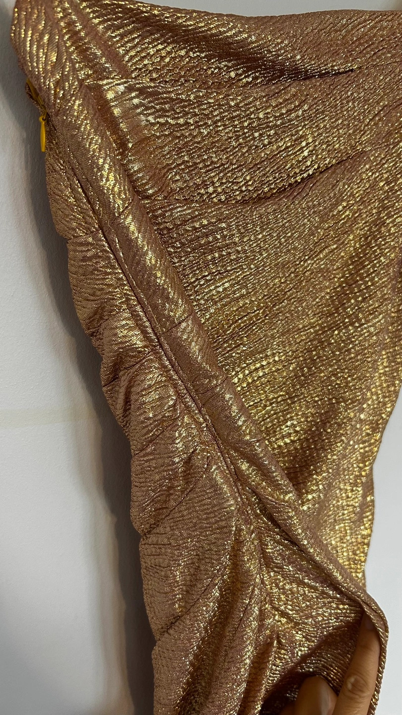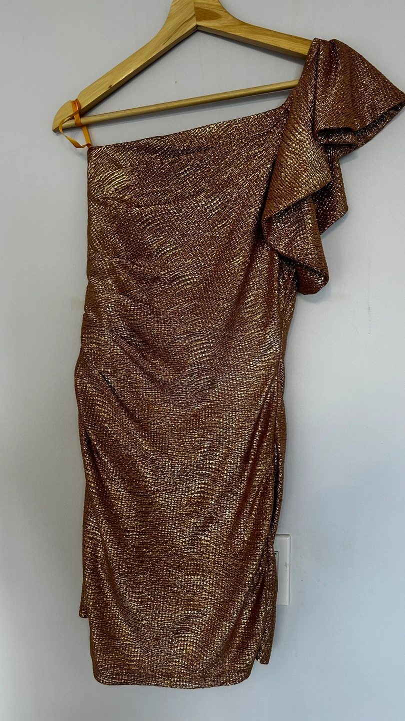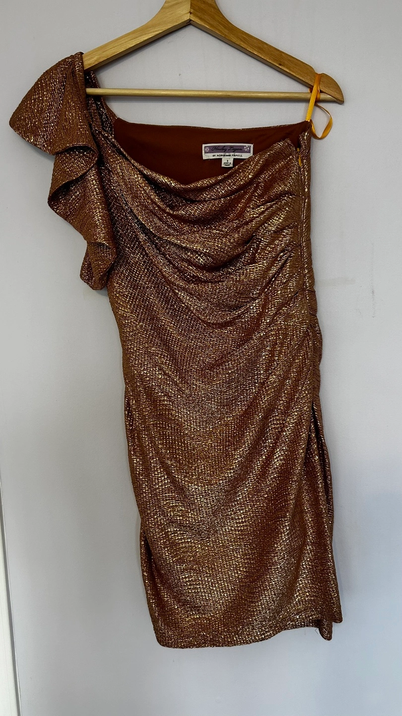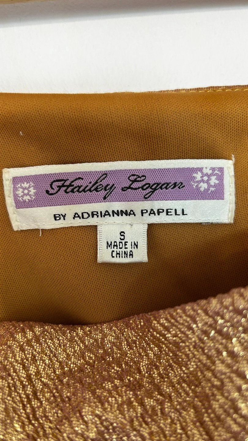 Selling a Hailey Logan dress by Adrianna Papell in size small. It features a one-shoulder design with a ruffled accent and a shimmering, textured fabric. Perfect for a night out or special occasion!