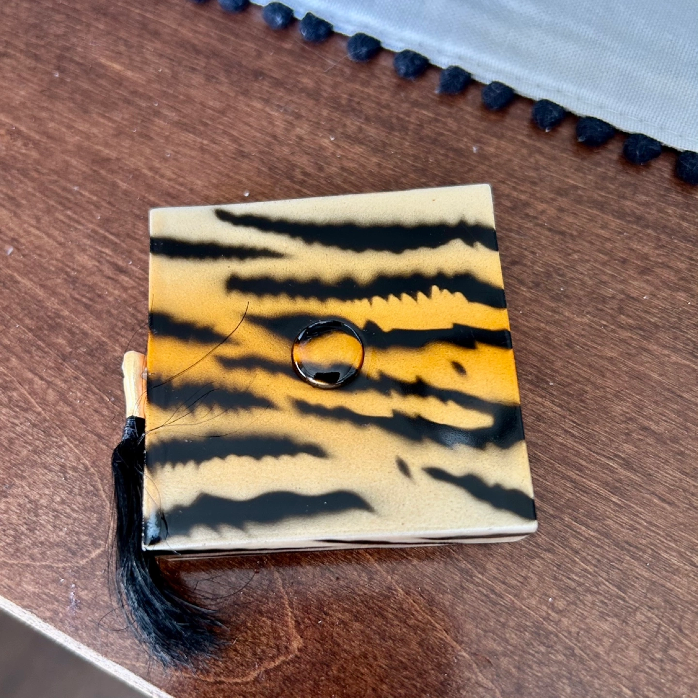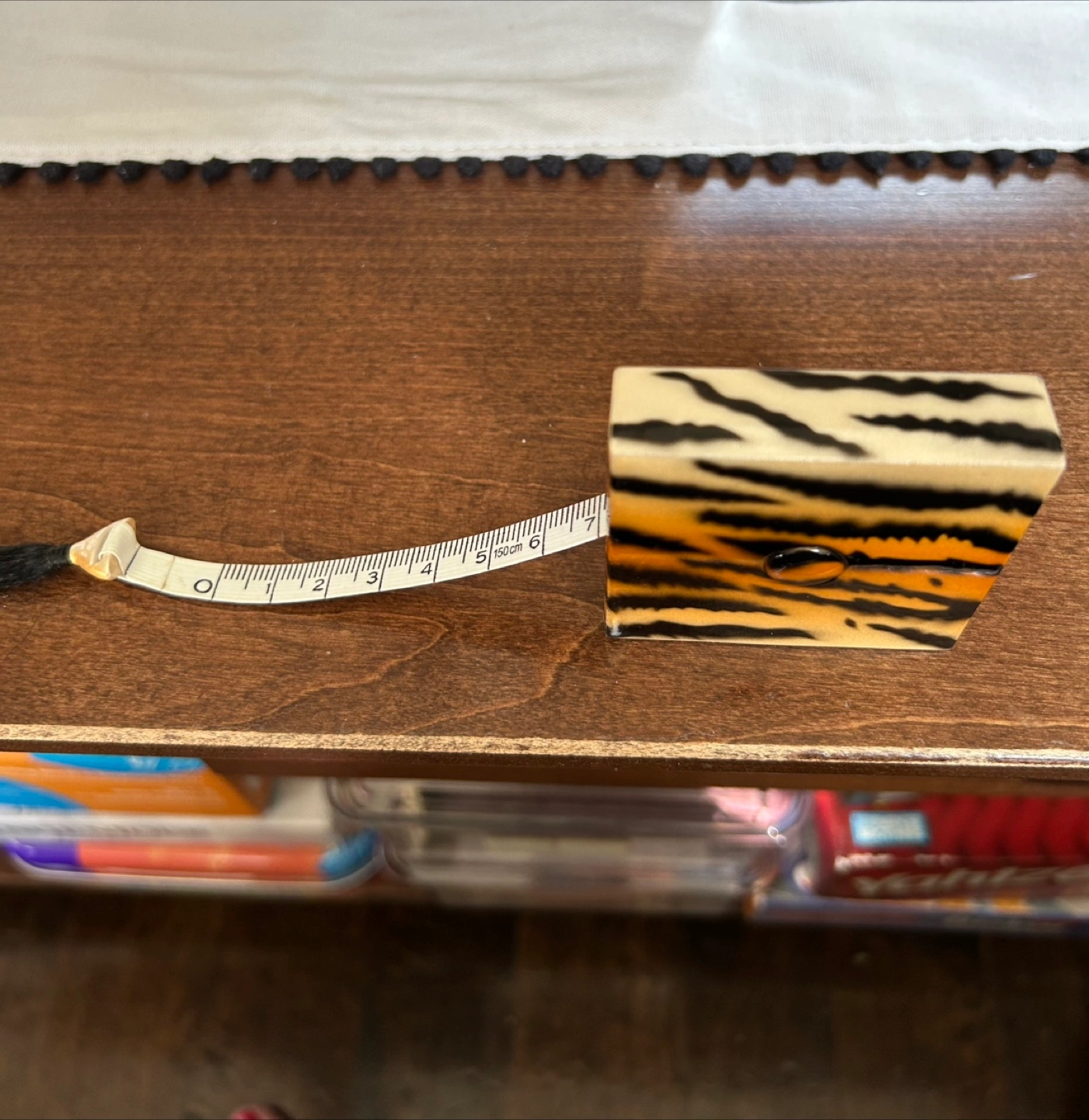 Here's a unique tape measure with a fun tiger print design! It's in great shape and ready to help with your measuring needs. The tape extends to 150cm / 60 inches. Fits in pocket or purse and retracts when you press button.