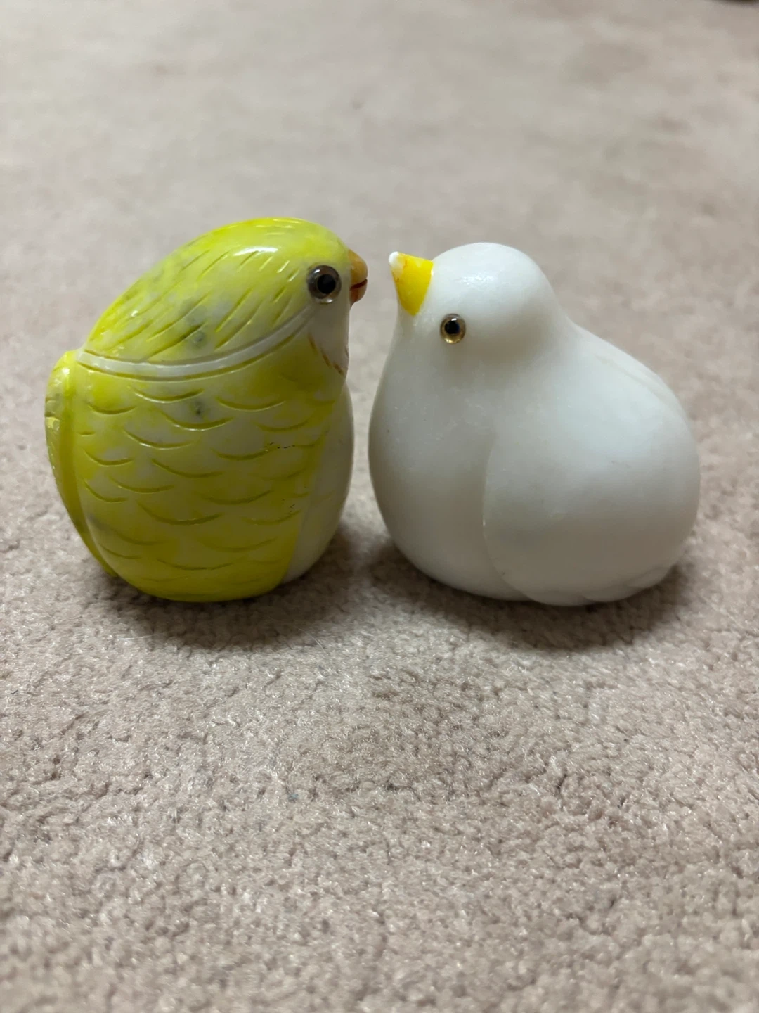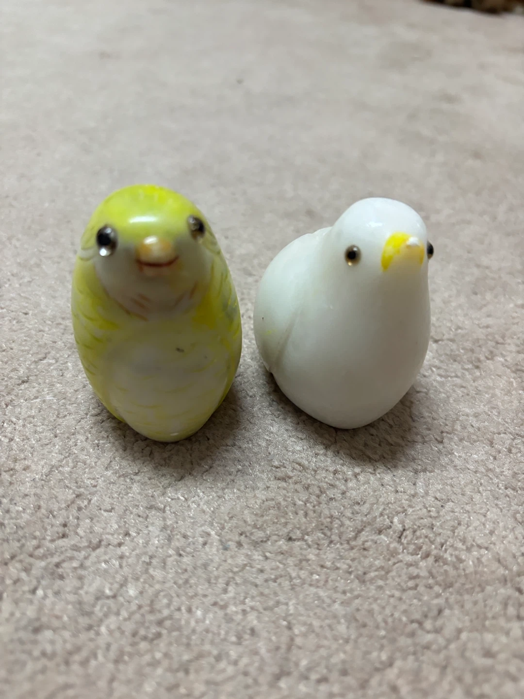 These are two cute stone bird figurines! One is yellow and the other is white. They would make a lovely addition to any collection or as a decorative piece in your home.