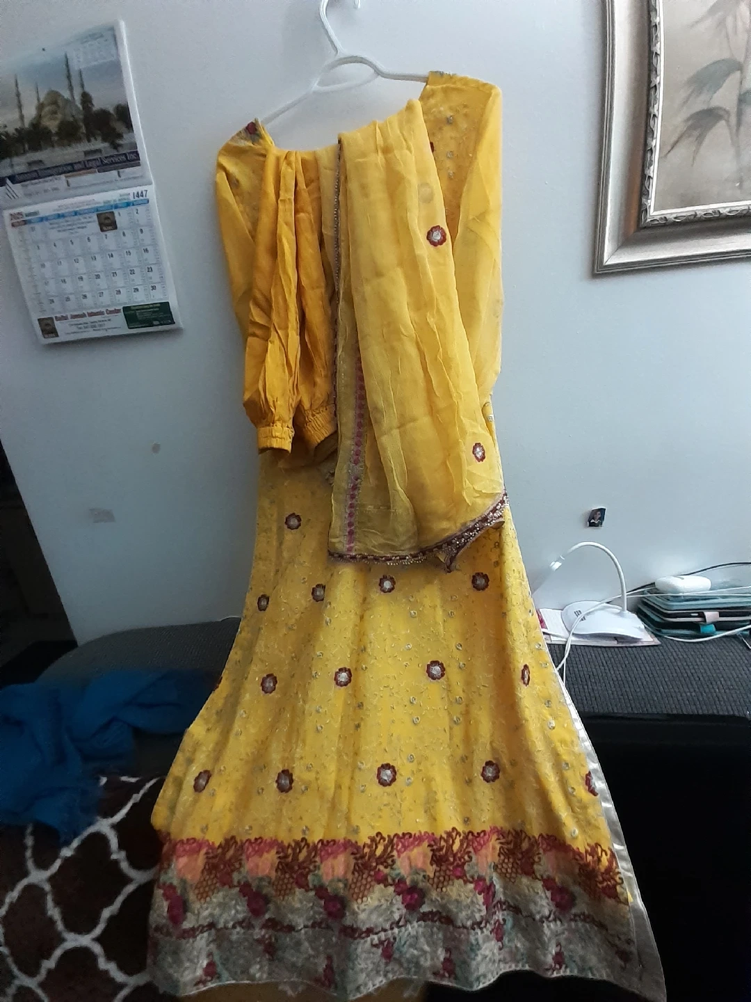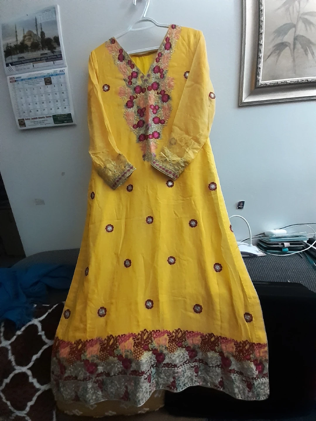 This is a beautiful yellow dress with intricate embroidery. It's in great condition and ready for a new home. The material feels lightweight and comfortable, perfect for a special occasion or just feeling a bit fancy. The dress features lovely detailing around the neckline and hem. It's a unique piece that's sure to turn heads! size Small to medium chiffon material fully embroidery works $30 pick up Markham and Lawrence