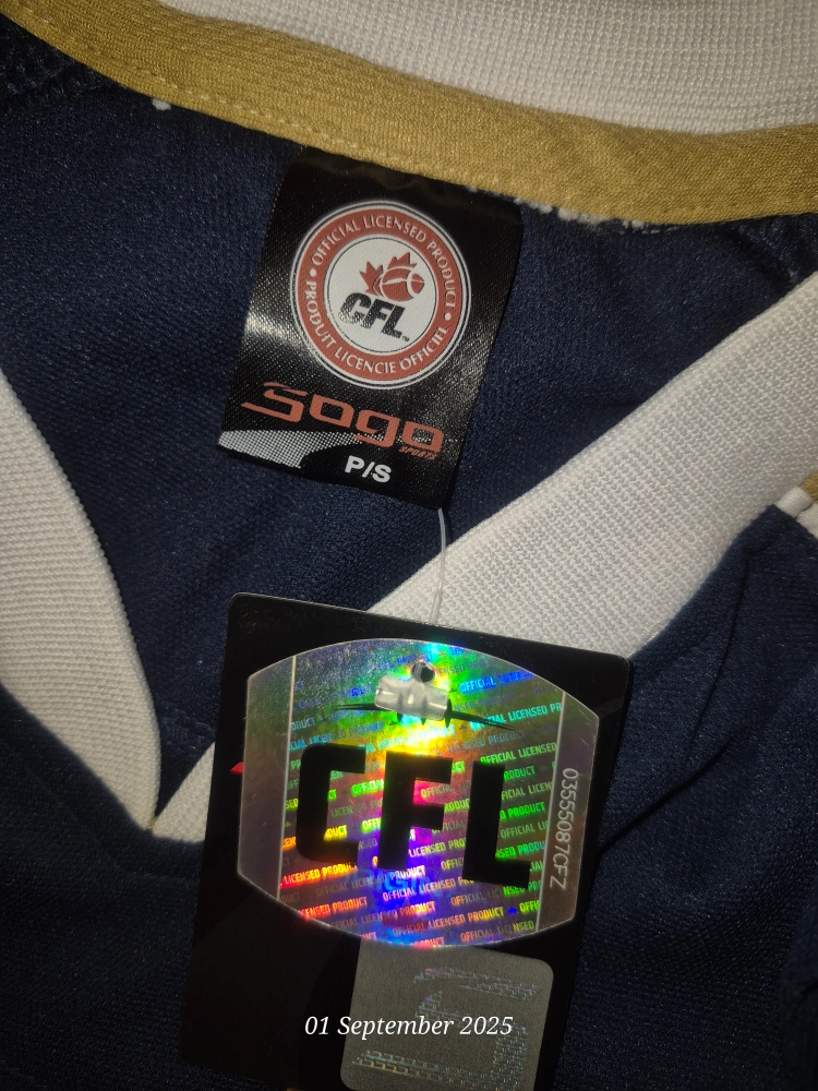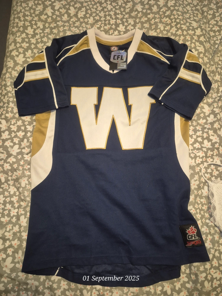 Selling a brandnew CFL Winnipeg Blue Bombers jersey in size small! It's in great condition and ready for a new fan. The jersey features the iconic 'W' logo and team colours. Perfect for showing your team spirit! (short sleeves)