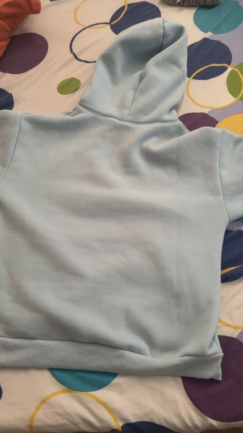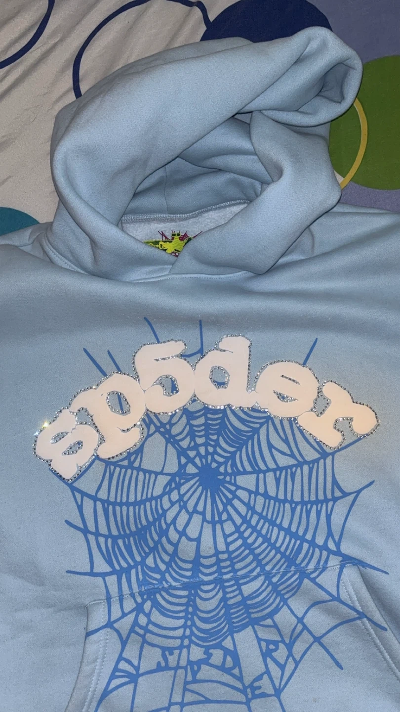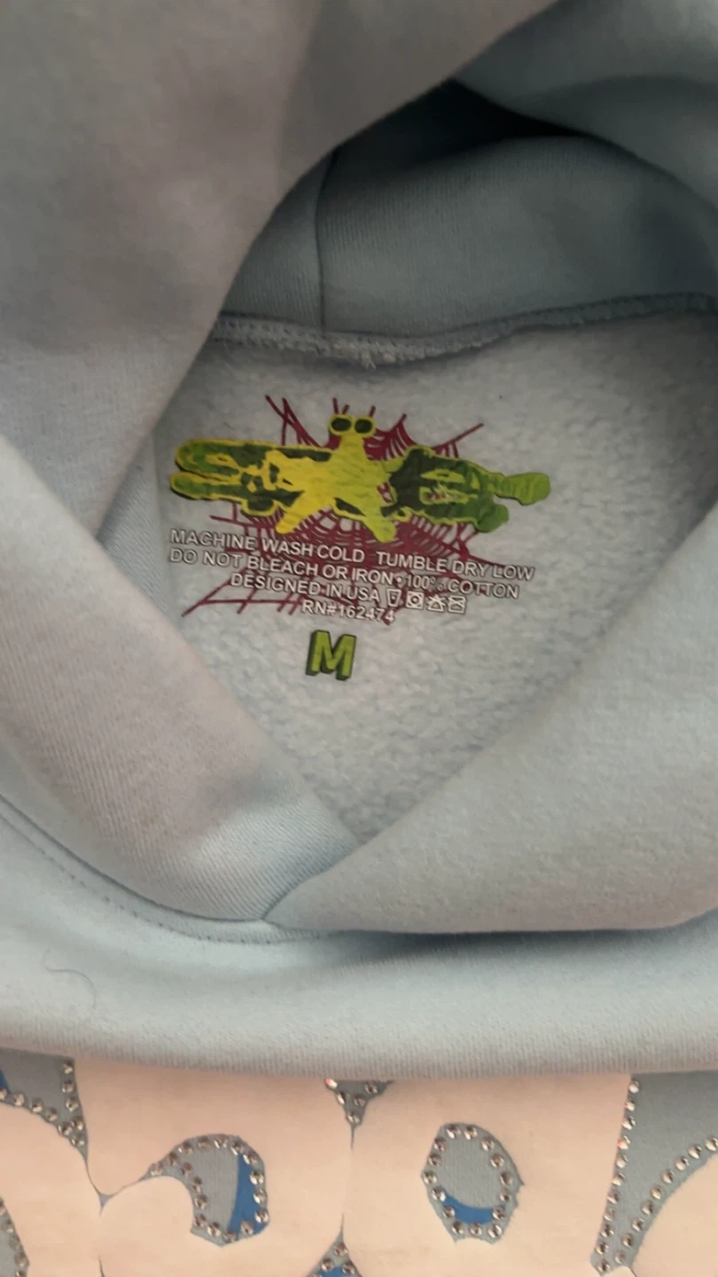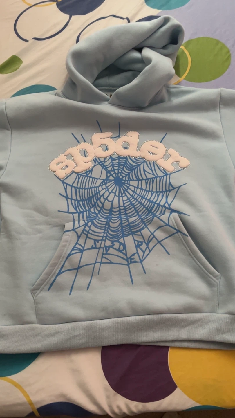 Selling a Sp5der hoodie in size medium. It's in great condition and features a cool spiderweb design on the front. The hoodie is a light blue colour and made of cotton. It's super comfy and perfect for everyday wear!