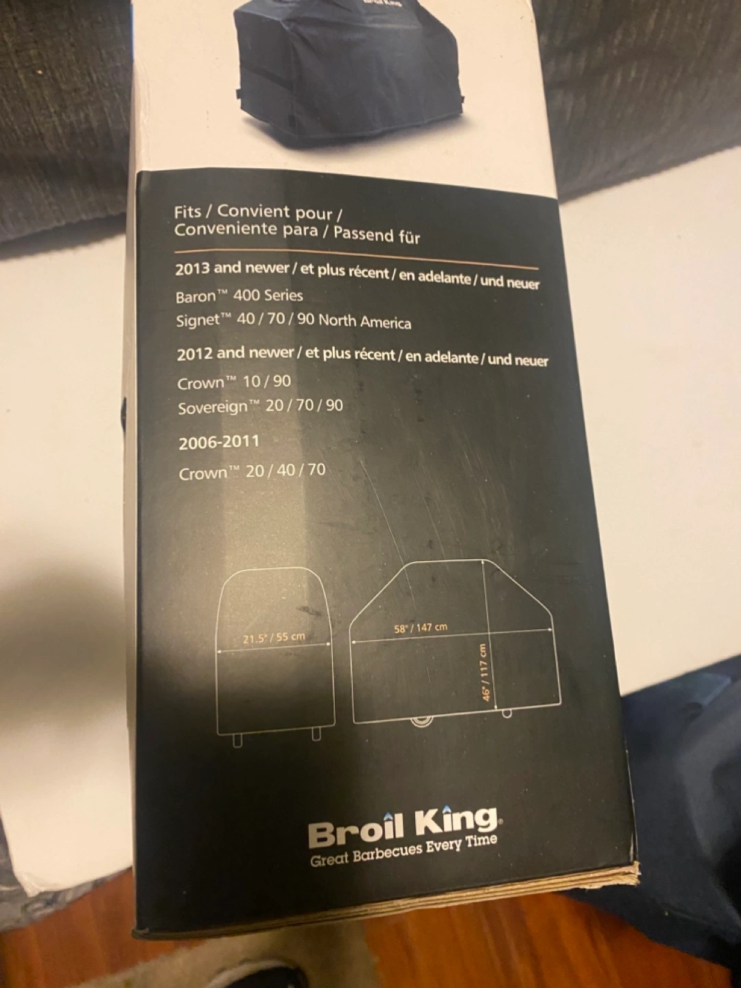 Selling a Broil King grill cover that fits the Baron 400 series, Signet 40/70/90 North America, Crown 10/90, Sovereign 20/70/90, and Crown 20/40/70 models. The cover is 58" x 21.5" x 46" (147 x 55 x 117 cm). Originally bought for $99.00, comes with original box. It is new.