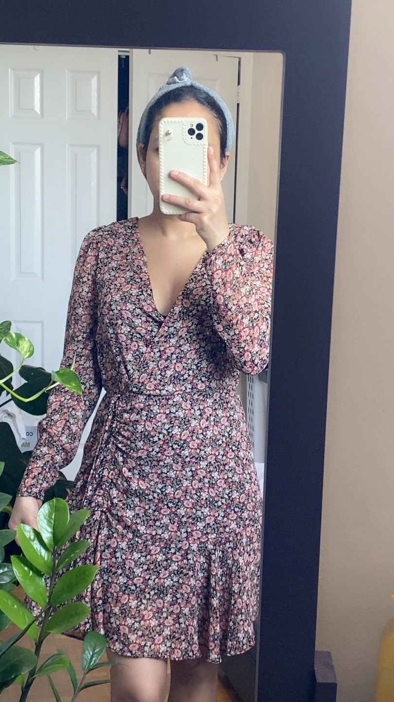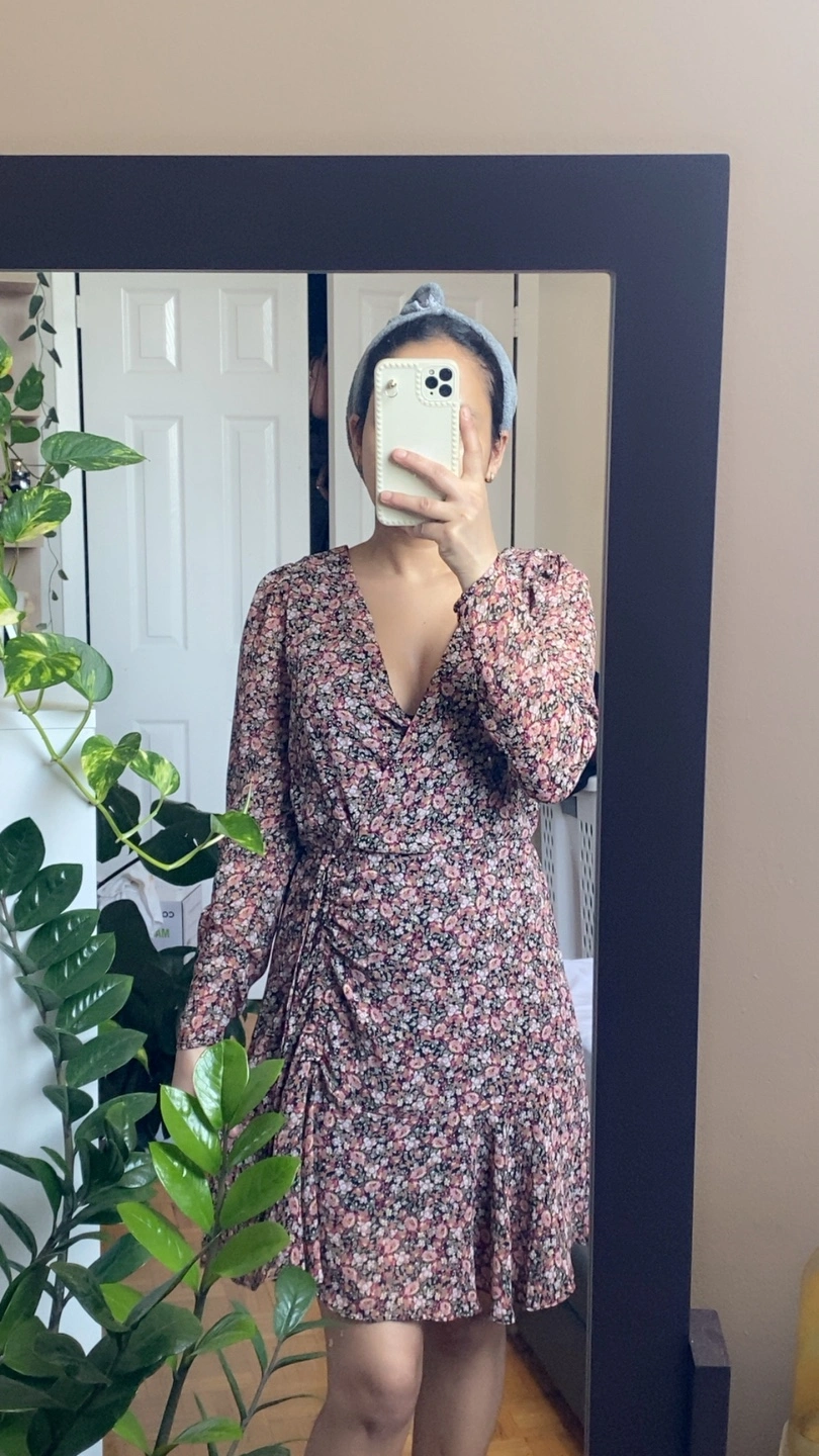 Selling a cute floral print mini dress! It's perfect for a casual day out or a summer event. The dress features a flattering wrap design and a ruched detail on one side. It's in great condition and ready for a new home