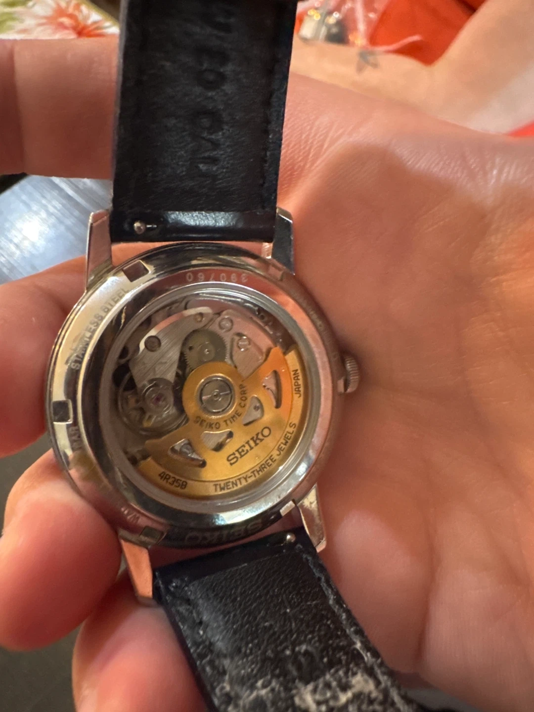 Selling a Seiko Presage automatic watch! It features a sleek design with a black leather strap and a visible movement on the back. A stylish and reliable timepiece for any occasion