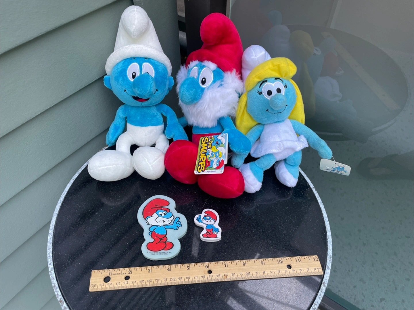 A collection of Smurfs plush toys, including Smurfette, Papa Smurf, and another Smurf. Also includes two Smurf erasers! These are in great shape and ready for a new home