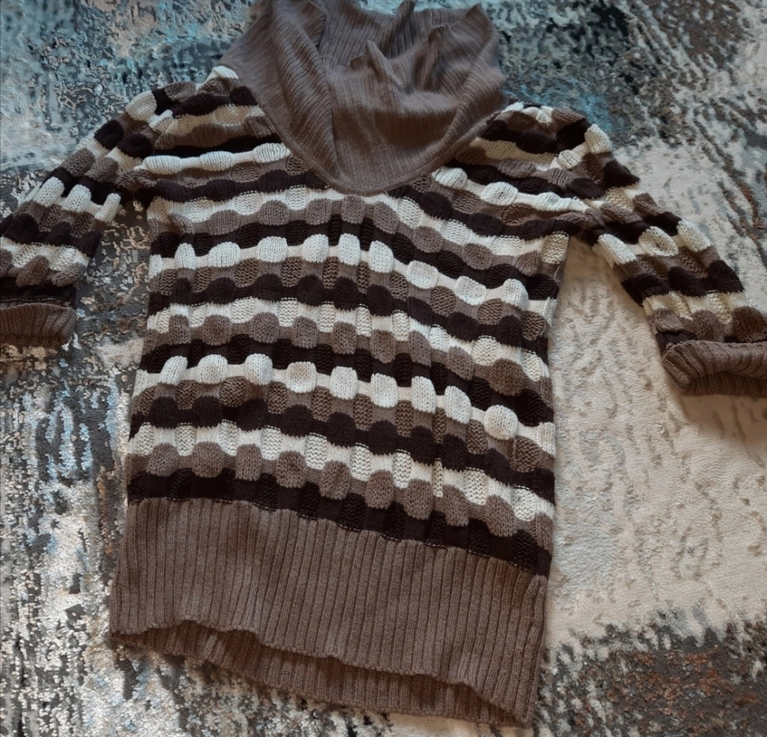 Here's a cozy tunic sweater in various shades of brown and cream. It has a unique striped pattern with a cowl neck . Perfect for staying warm and stylish during the colder months!