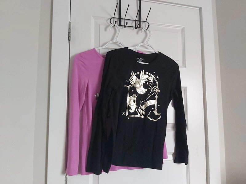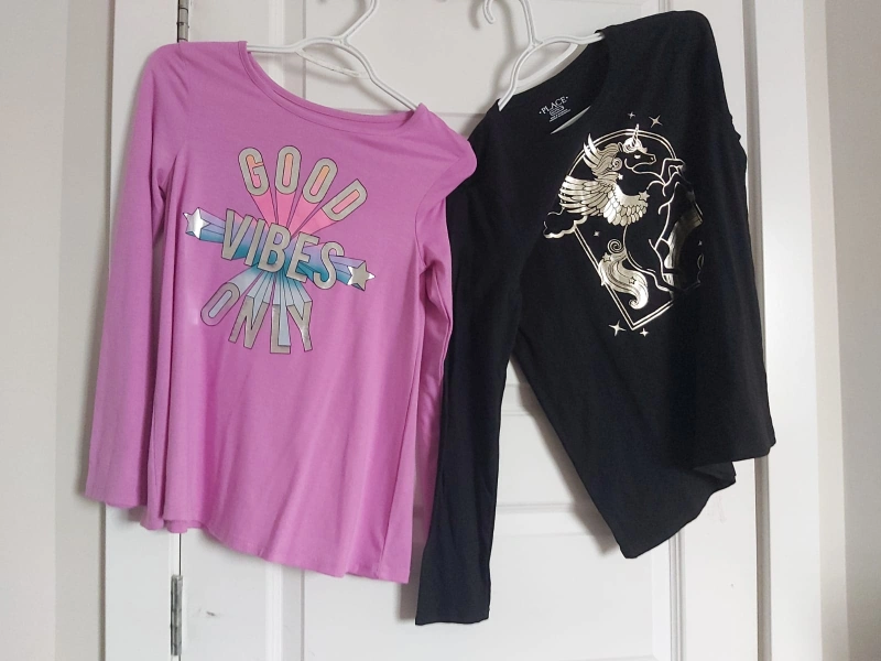 Two cute long-sleeve shirts from The Children's Place for girls, size 10/12! One is a vibrant pink with a 'Good Vibes Only' design, and the other is black with a stylish gold unicorn graphic. Both are in great condition and ready for a new home!