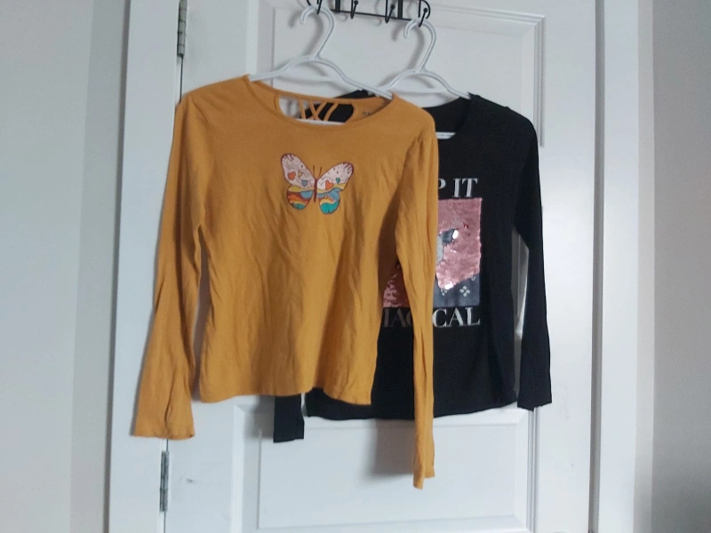 Two long sleeve tops for girls. One is black with a sequin deer design that says "Keep It Magical". The other is mustard yellow with a butterfly design. Both are from Joe Fresh