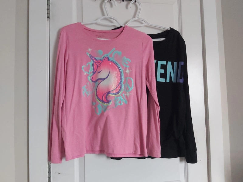 Two long-sleeve shirts from The Children's Place for girls. One is pink with a unicorn graphic, and the other is black with a 'Weekend' print. Both are in great condition and ready for a new home!
