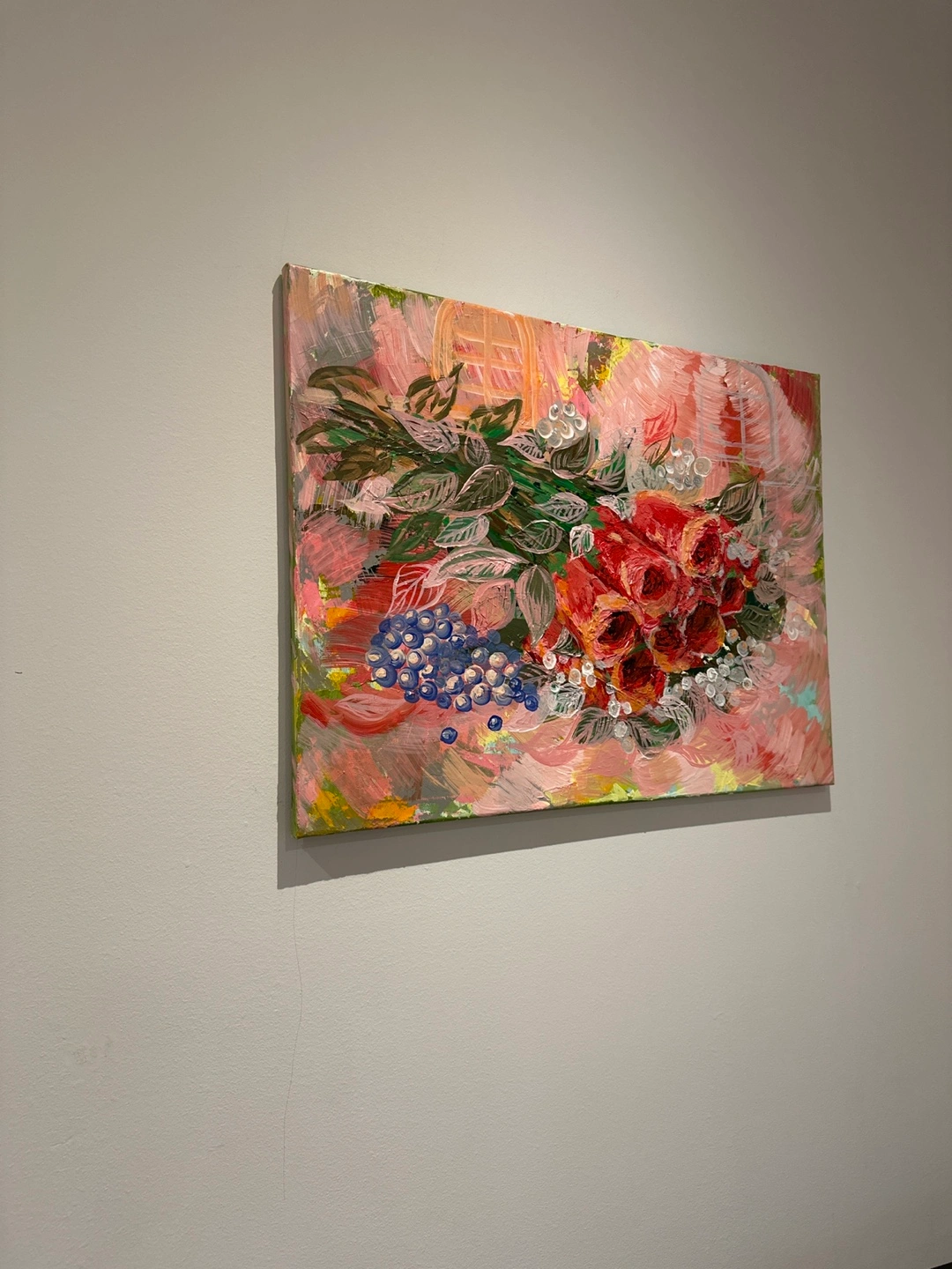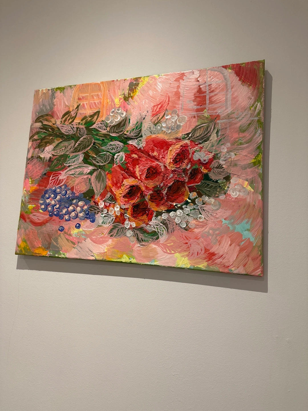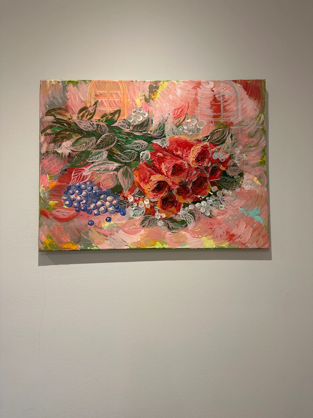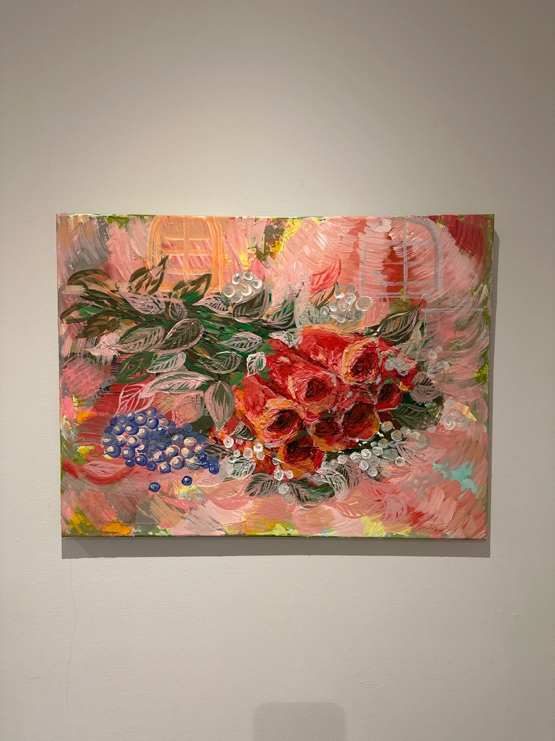 To be sweet atmosphere to your house. By brunch on the canvas. Here's a lovely floral Acrylic painting, perfect for adding a touch of colour to any room! The painting features a bouquet of red roses and blue berries with green leaves on a pink background