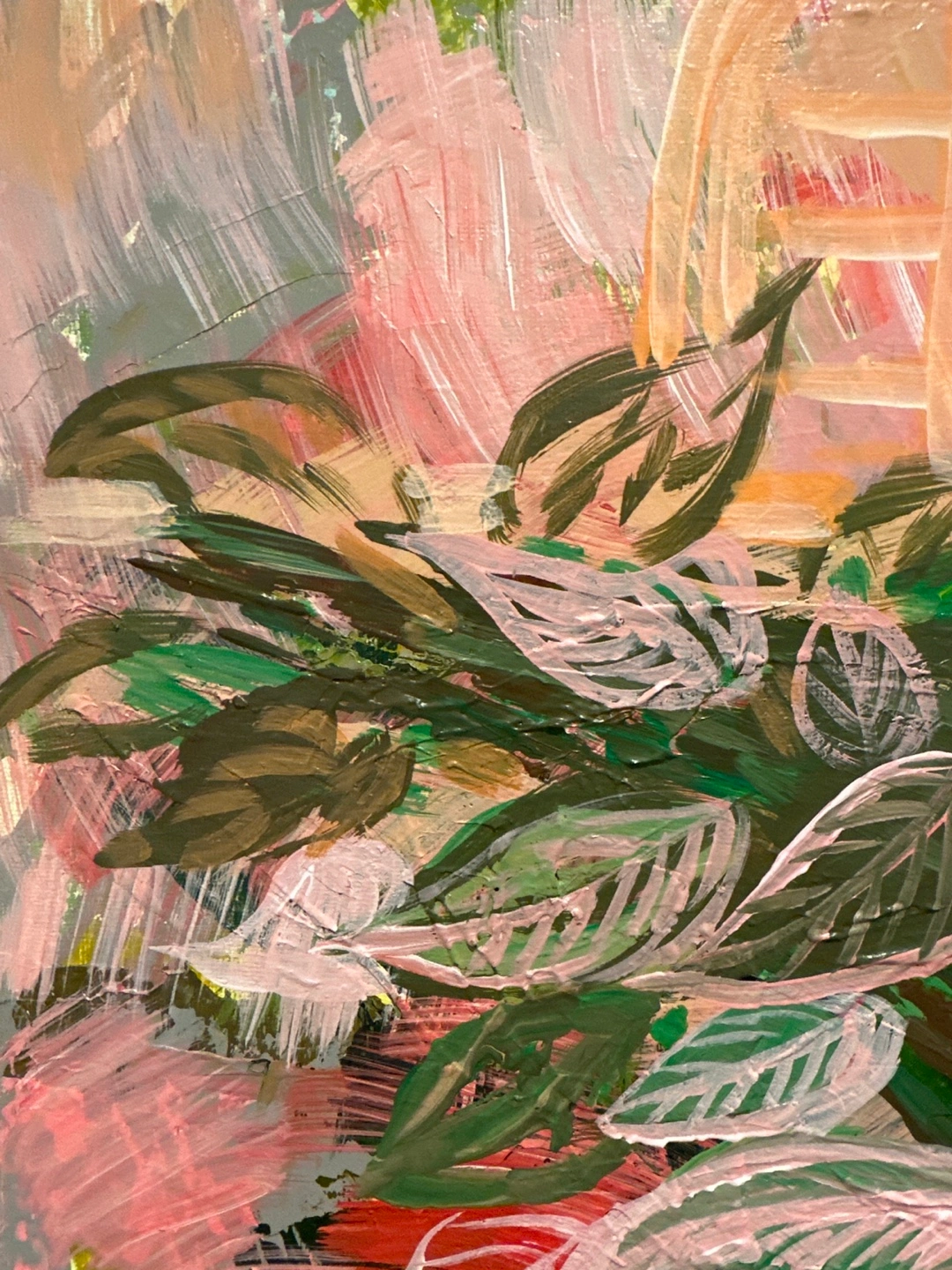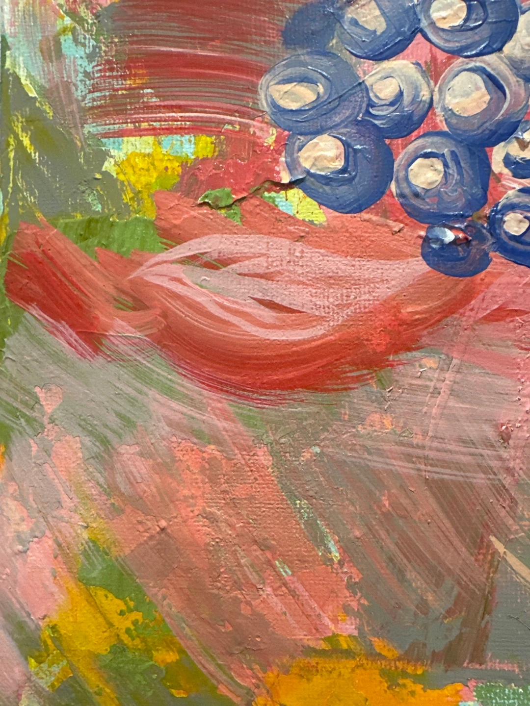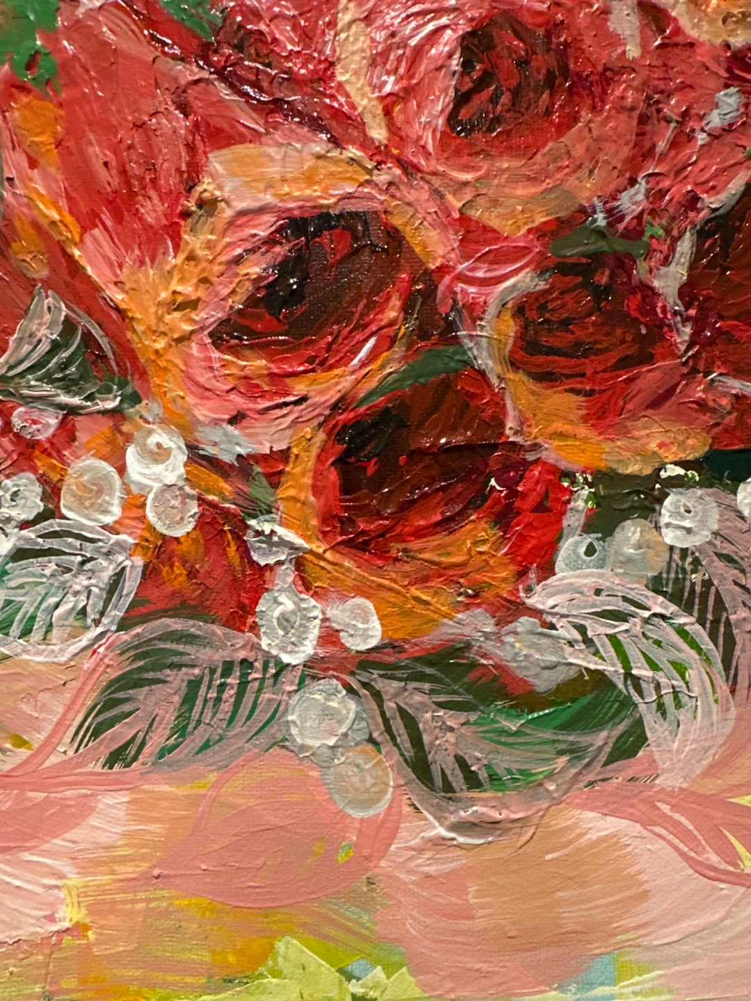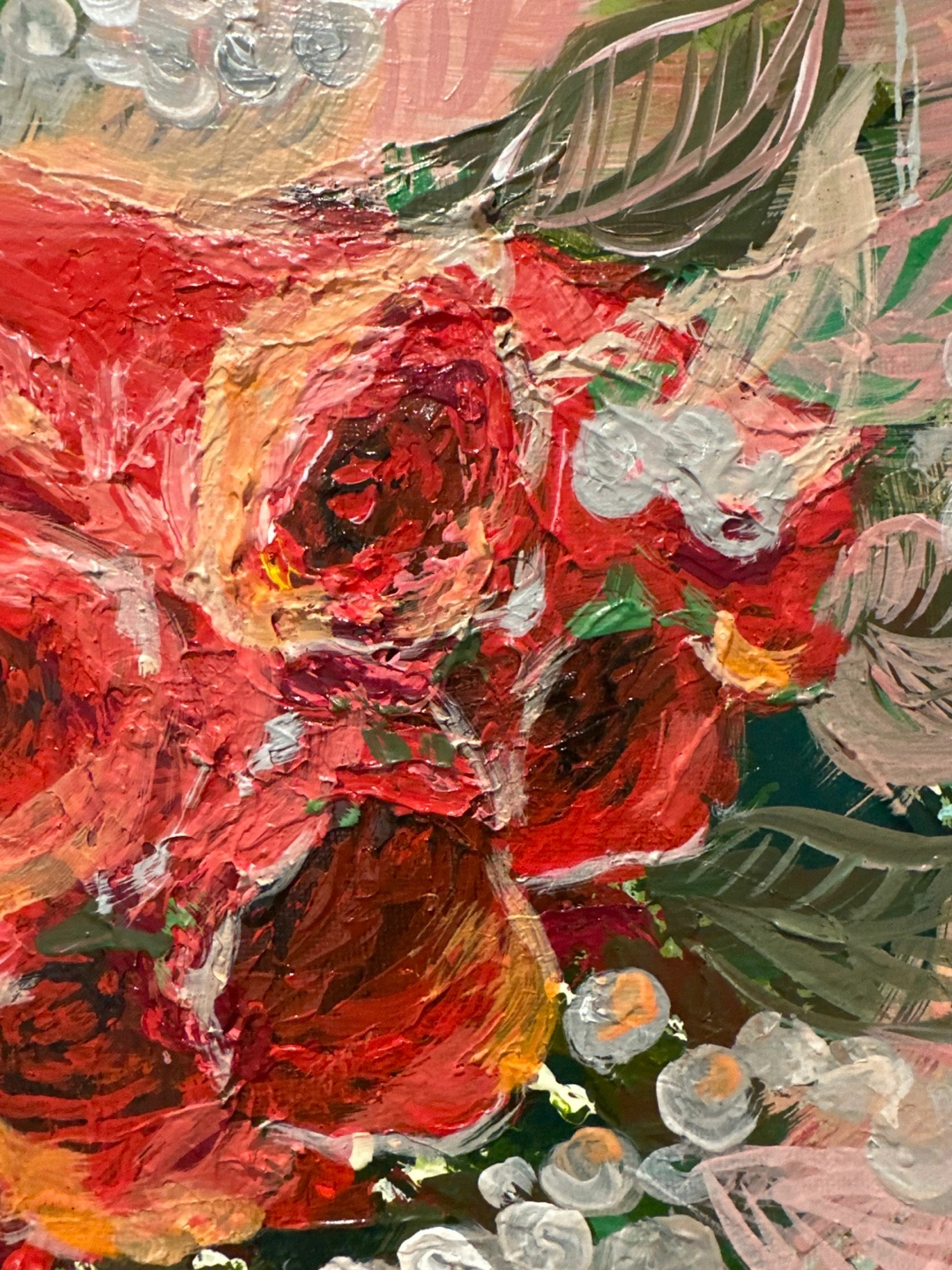 To be sweet atmosphere to your house. By brunch on the canvas. Here's a lovely floral Acrylic painting, perfect for adding a touch of colour to any room! The painting features a bouquet of red roses and blue berries with green leaves on a pink background
