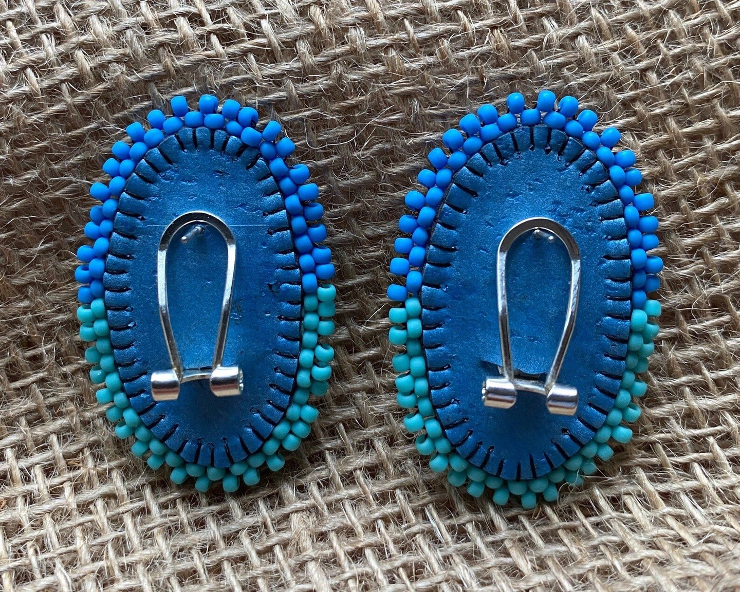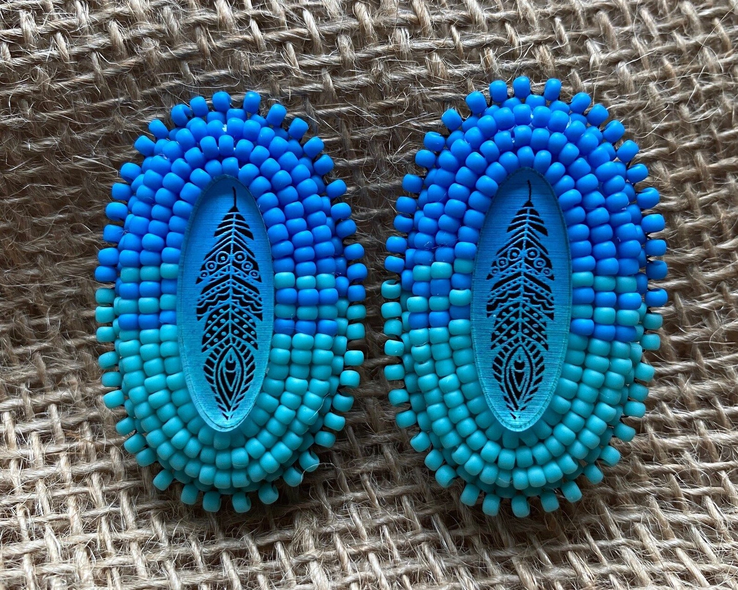 Closure: Latch back Length: 4.5 Centimeters; Width: 3 Centimeters These Blue Feather beaded earrings are one of the unique handmade creations from Raven Starlight. Blue Feather were handcrafted with: Hook: Rhodium plated Cabochon: Handmade Epoxy Resin Beads: Glass Thread: Nylon Interior: Polyester felt Back: Cork Pick-up from Yorkville