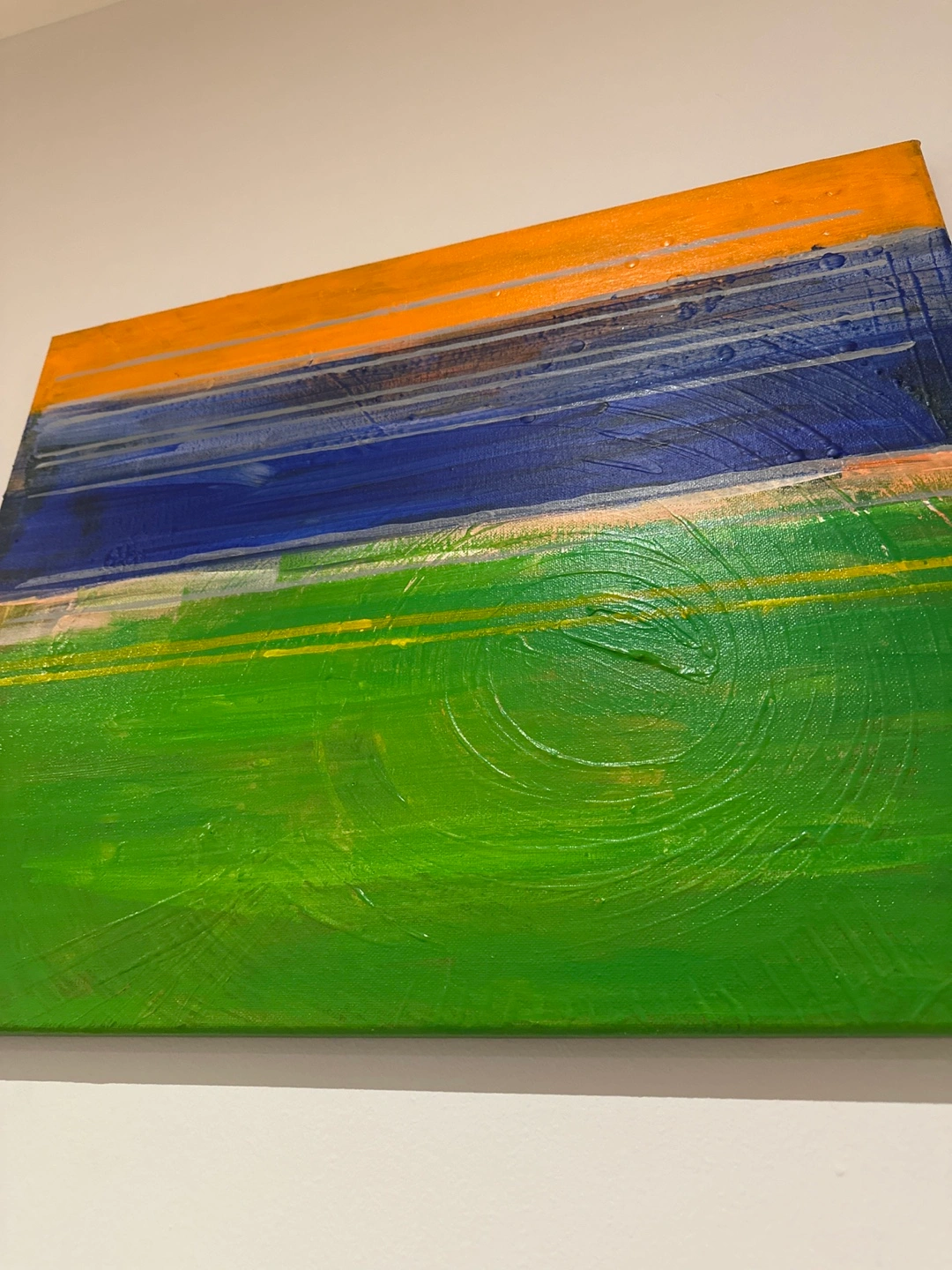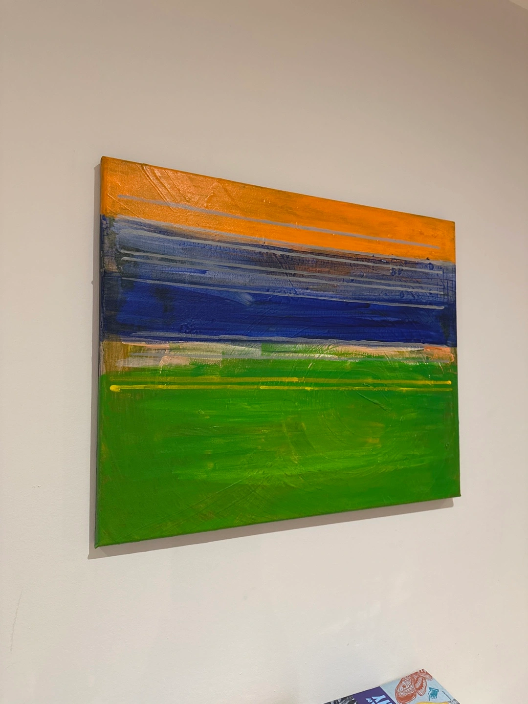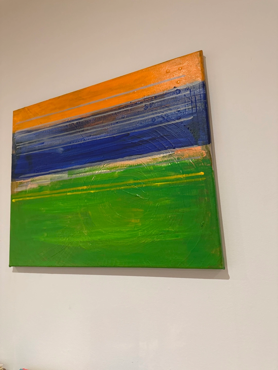 Modern style of Acrylic painting. You can see the texture of mixed colours on canvas. Abstract painting featuring a vibrant mix of orange, blue, and green hues. This piece would add a pop of colour to any room. It's in great condition and ready to find a new home!