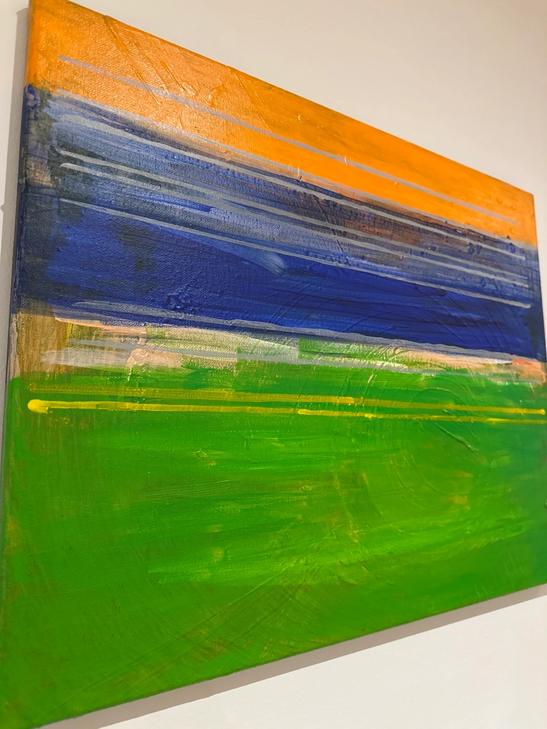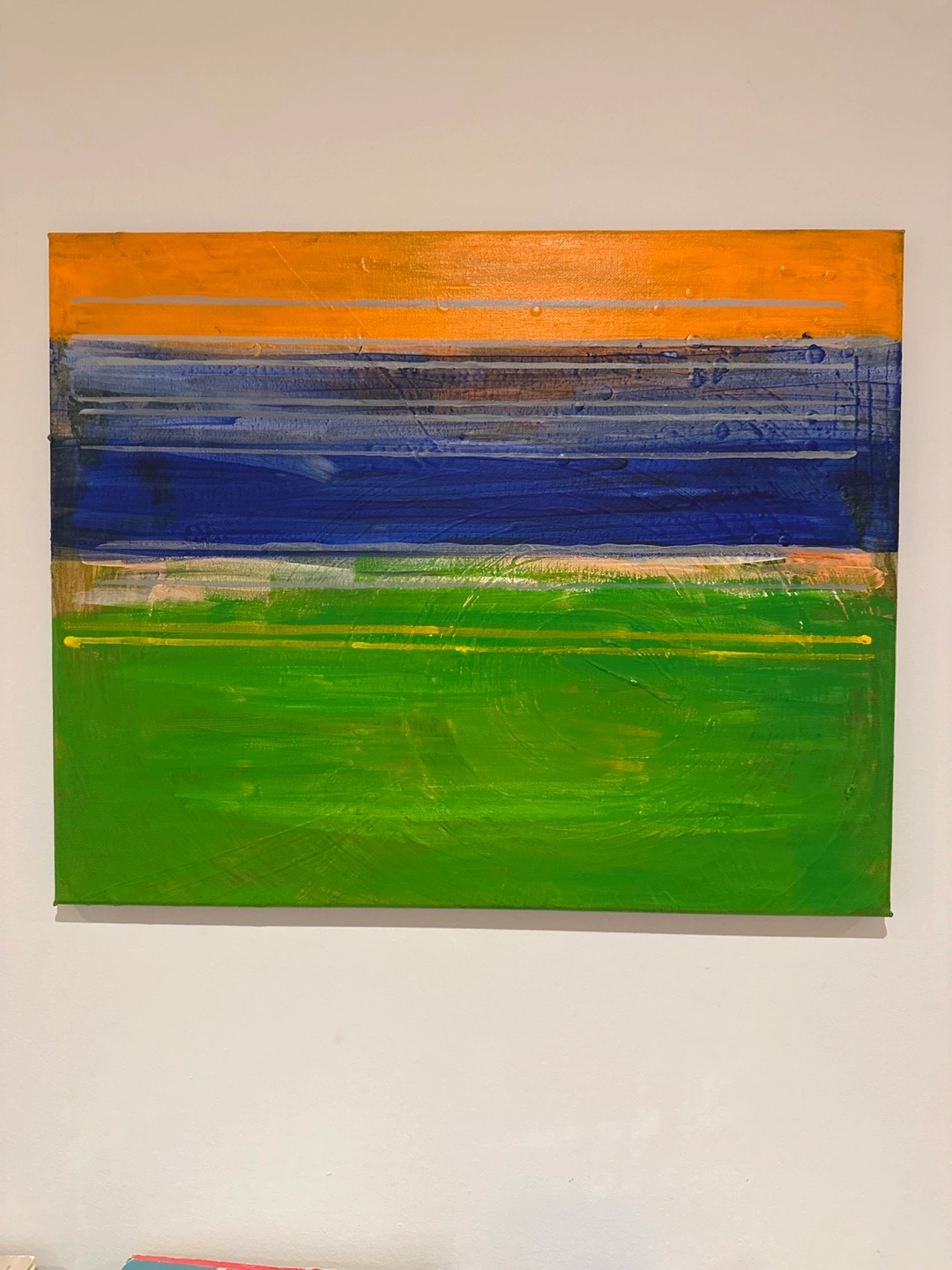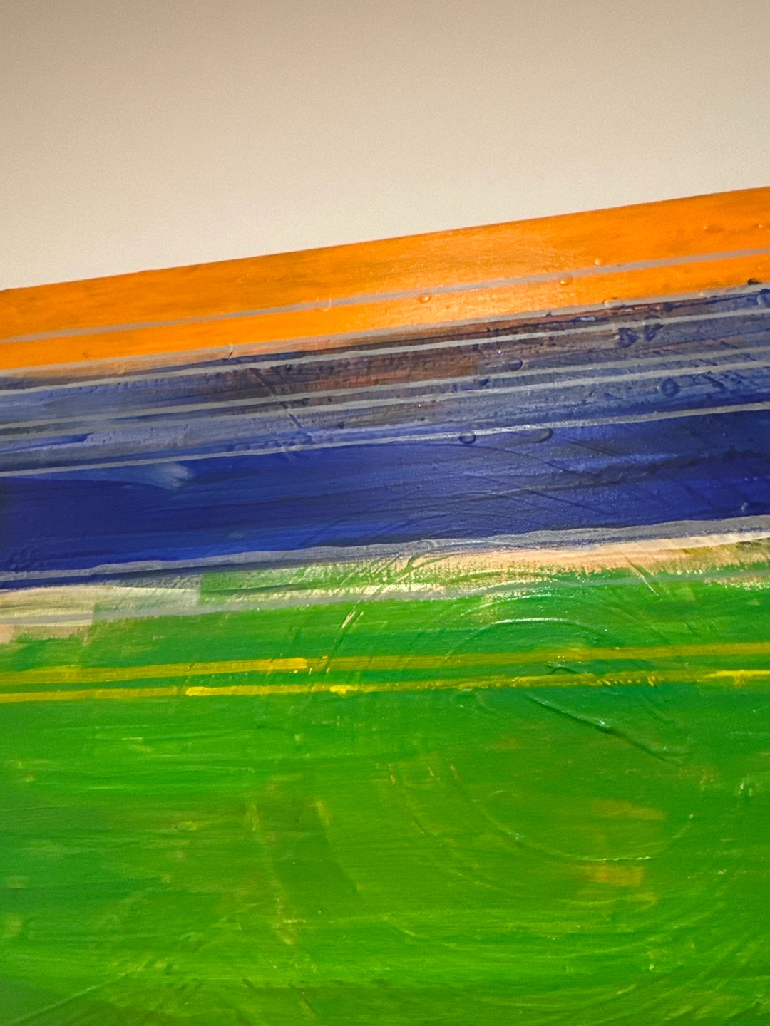 Modern style of Acrylic painting. You can see the texture of mixed colours on canvas. Abstract painting featuring a vibrant mix of orange, blue, and green hues. This piece would add a pop of colour to any room. It's in great condition and ready to find a new home!