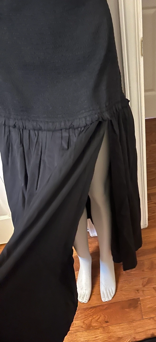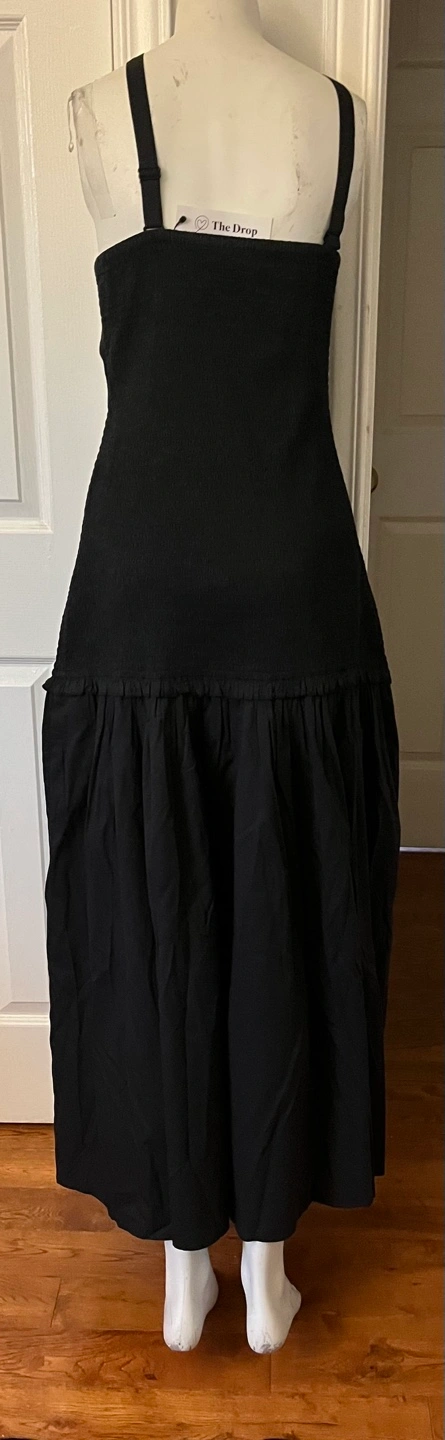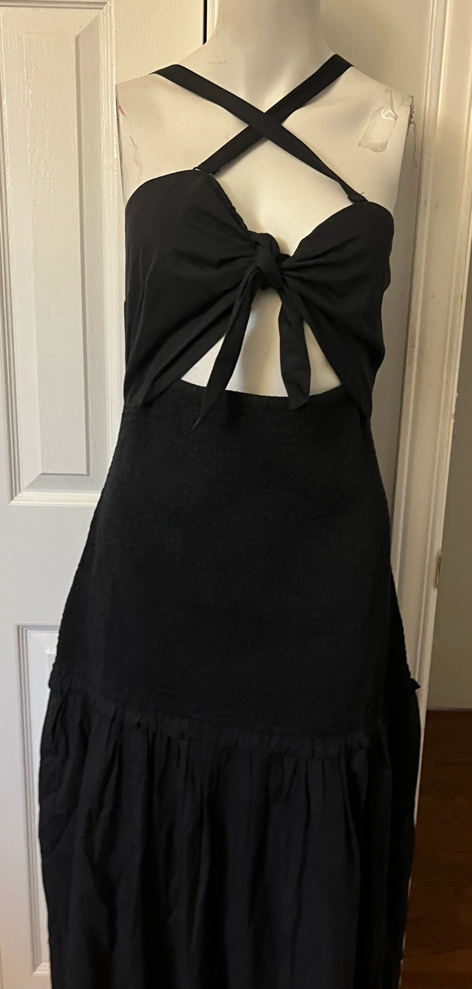 This is a black dress from The Drop. It features a unique design with a tie at the front and a drop waist. Perfect for a night out!
