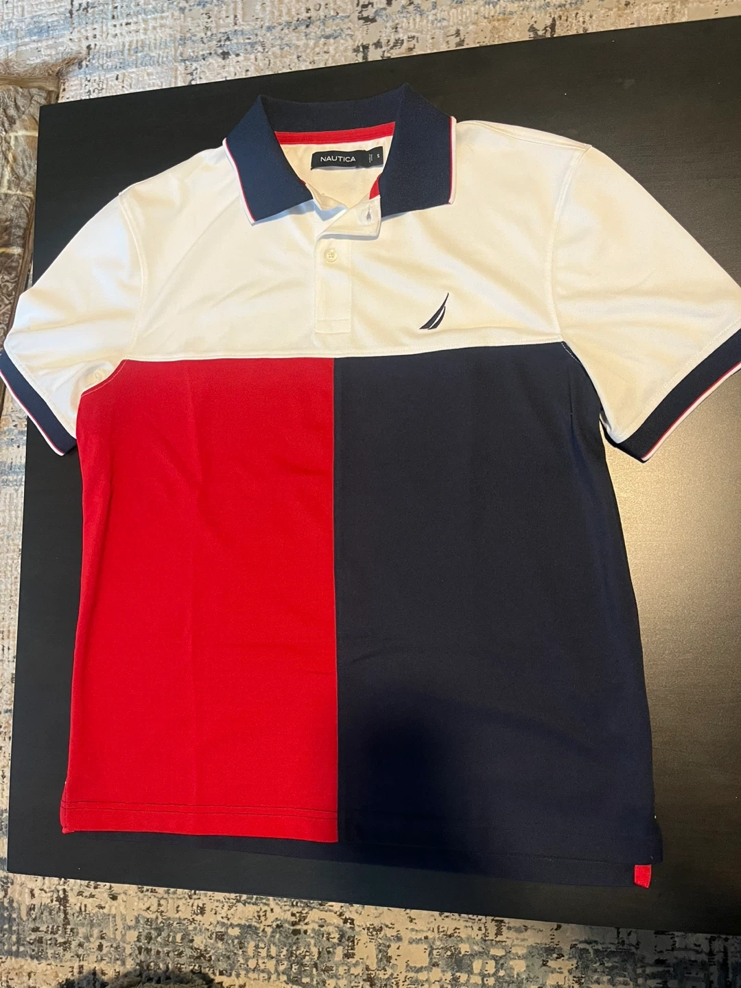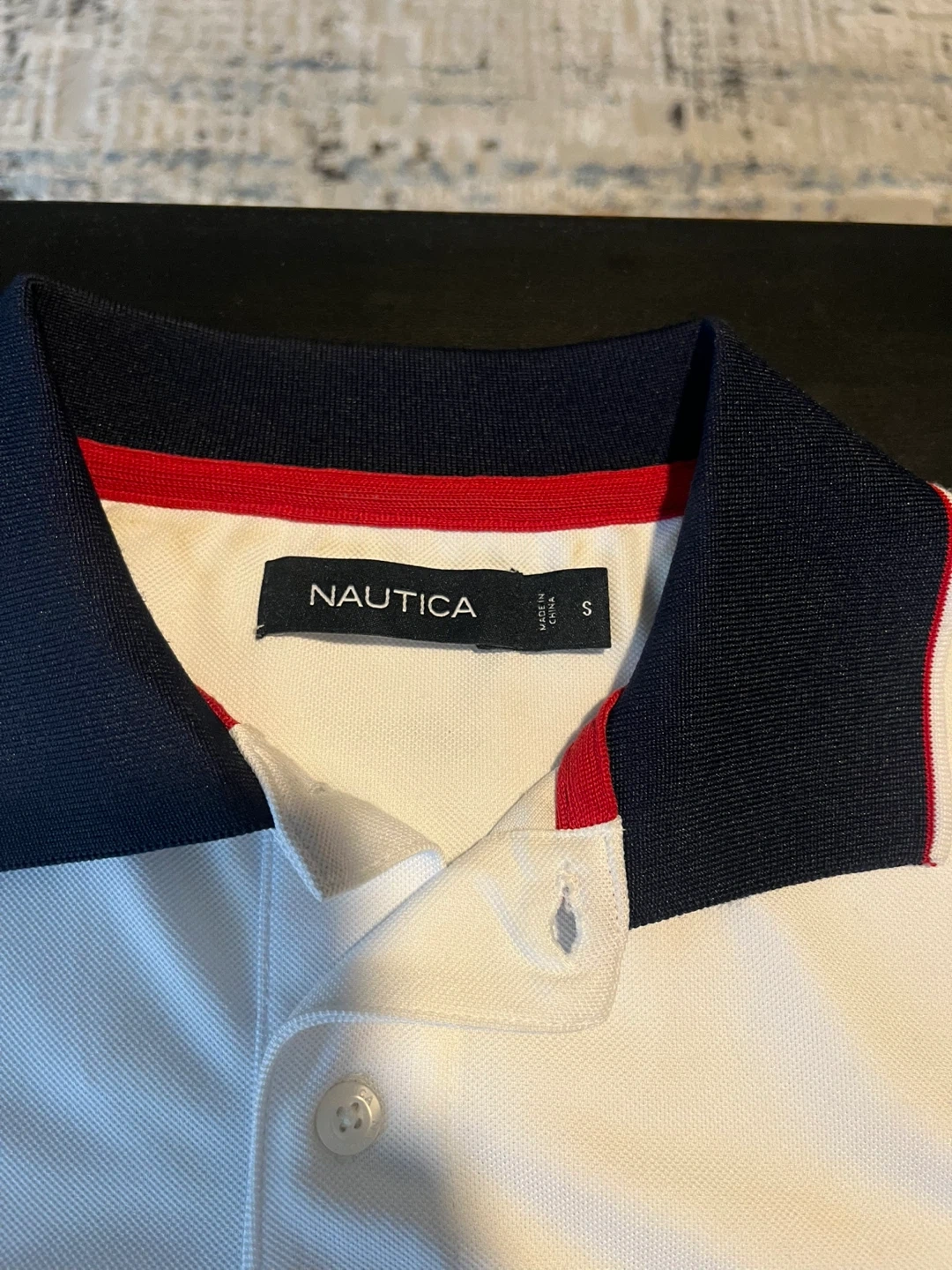 Here's a stylish Nautica shirt in a cool colour block design! It's a size small and features a classic white, navy, and red colour scheme. Perfect for a casual, preppy look!
