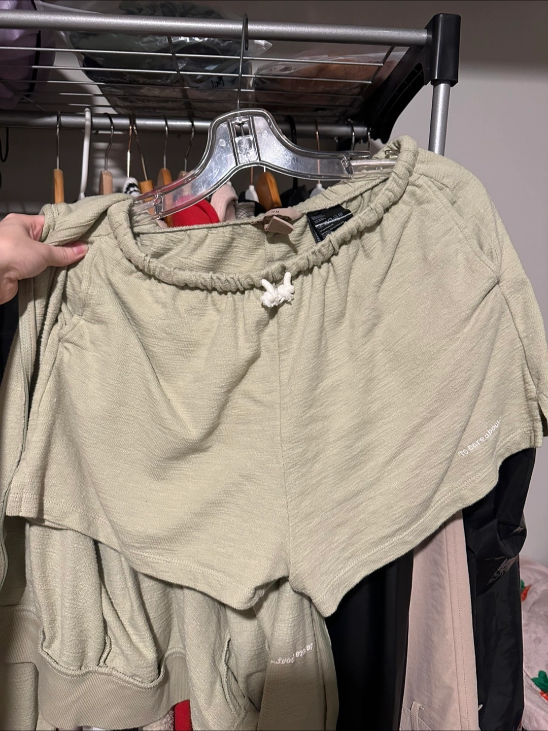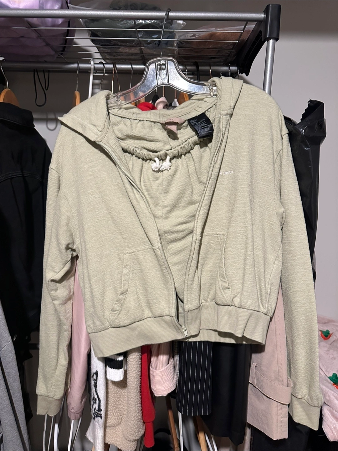 Selling a cute matching set from H&M! It includes a zip-up jacket and shorts, both in a light green colour. The material is soft and comfy, perfect for lounging around or running errands. Size is S