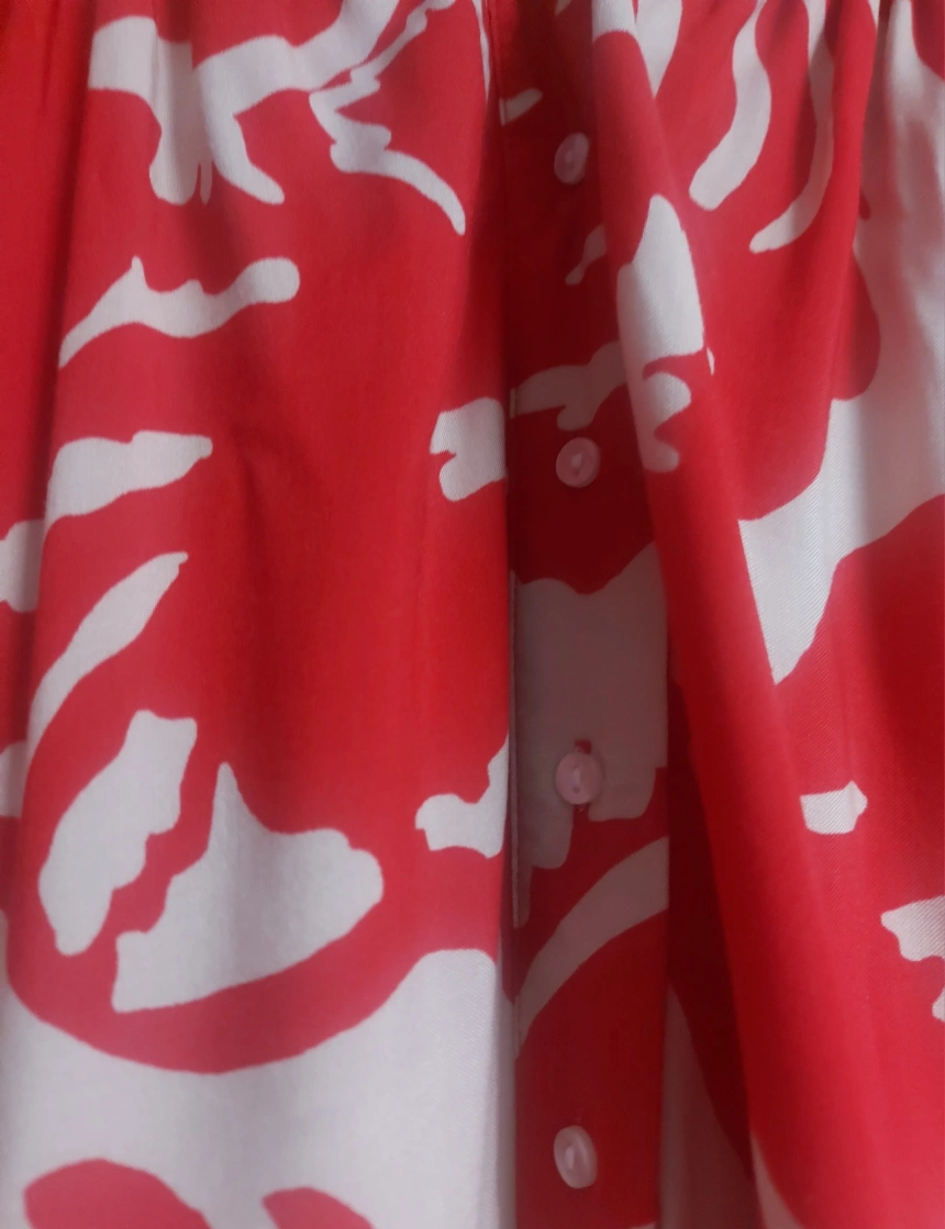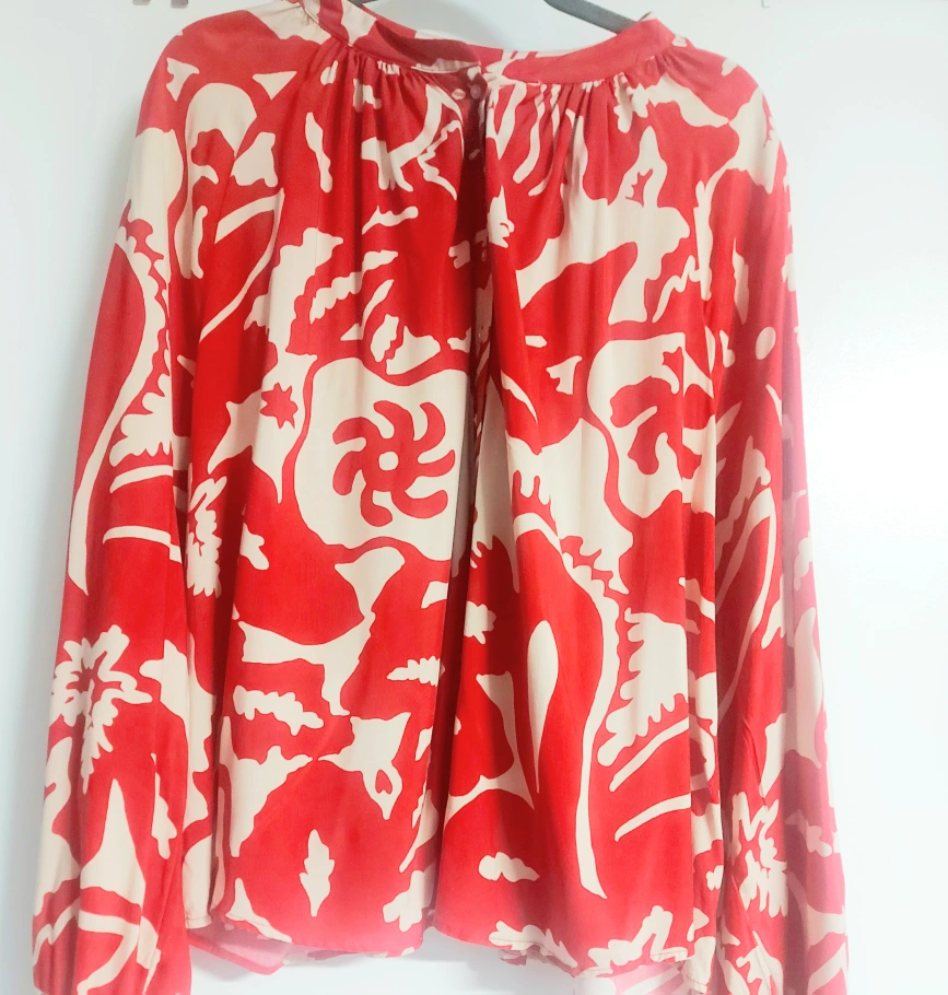 Selling a vibrant red and white patterned blouse. It's in great condition and ready for a new home. The material feels lovely and light, perfect for warmer weather. The design is eye-catching and unique, adding a pop of colour to any outfit. It’s a stylish addition to any wardrobe