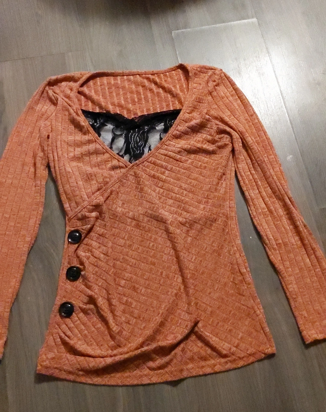Pink top with long sleeves and black lace detail at the neckline. Features three decorative buttons on the side. Perfect for adding a pop of colour to your wardrobe! Fits small or medium