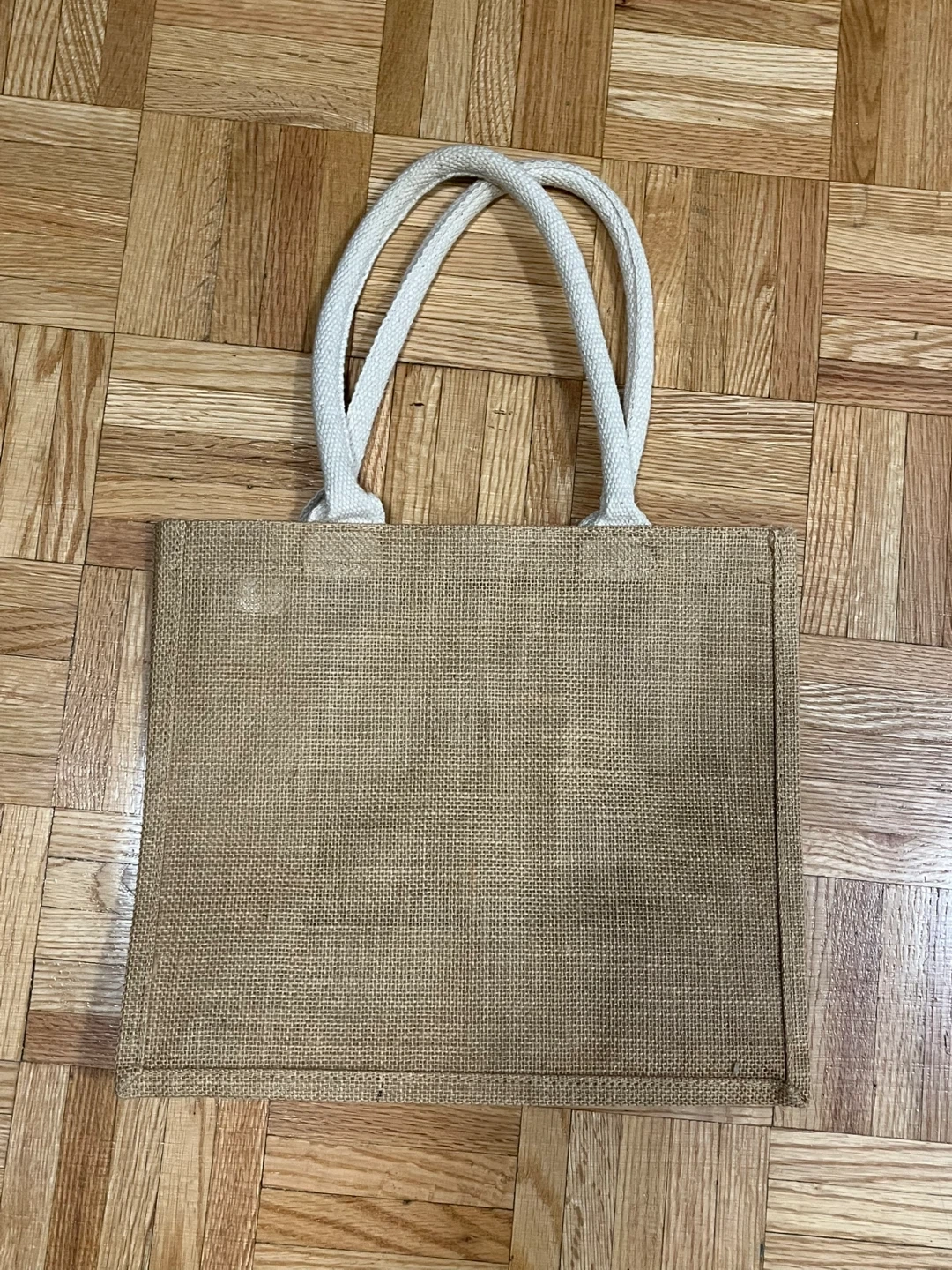 Selling a jute tote bag! It's in good condition and ready for your shopping trips or carrying your essentials. The handles are sturdy and comfortable to hold. Perfect for groceries, books, or anything else you need to carry around town