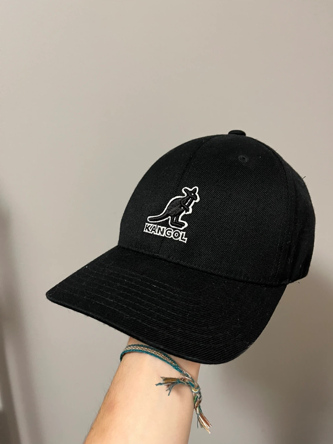 Selling a black Kangol baseball cap in size S/M. It's in great condition and features the classic Kangol logo. Perfect for adding a touch of style to any outfit!