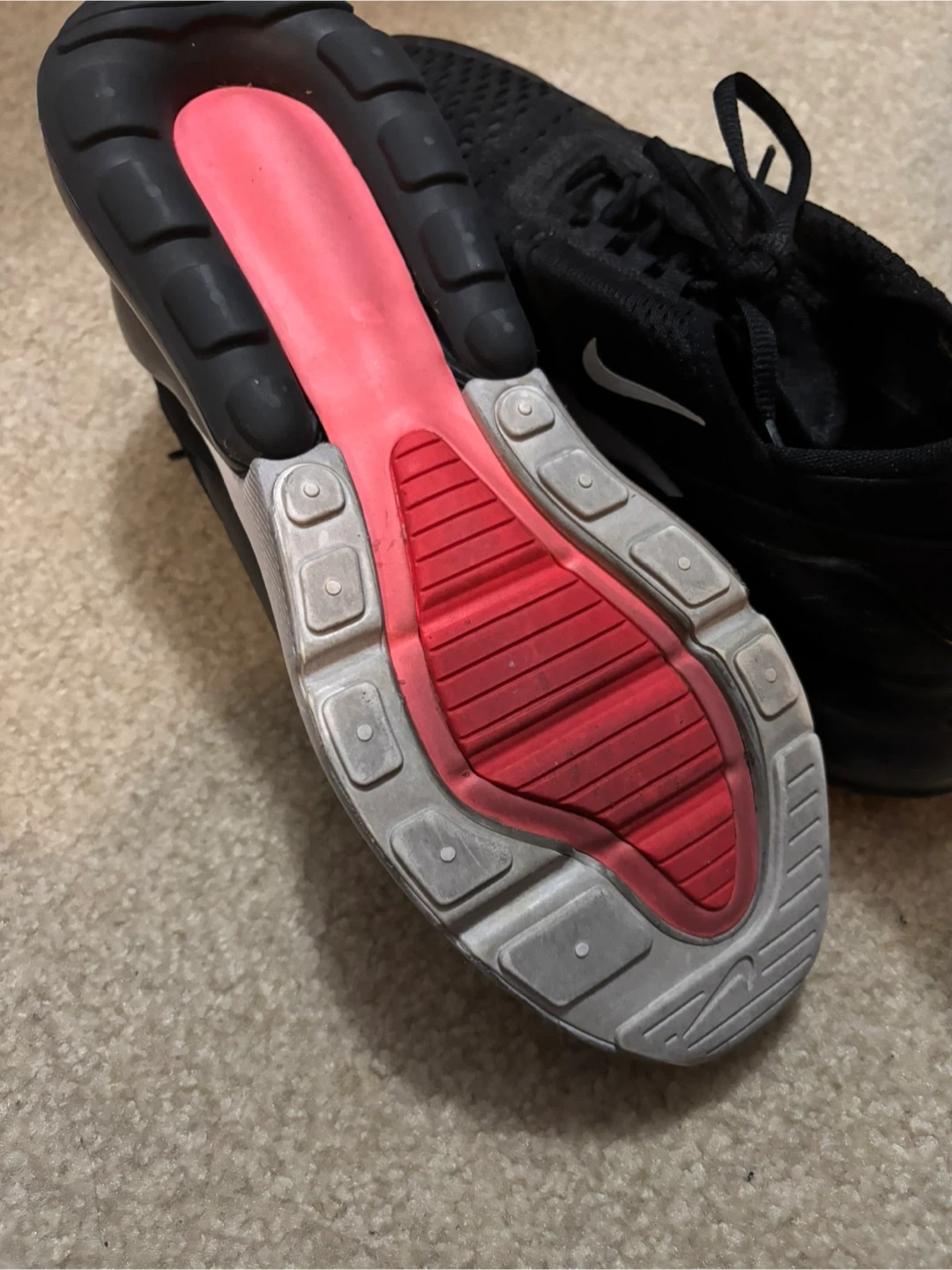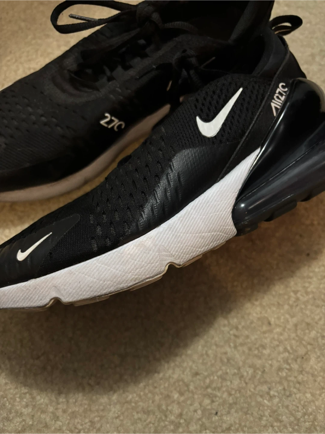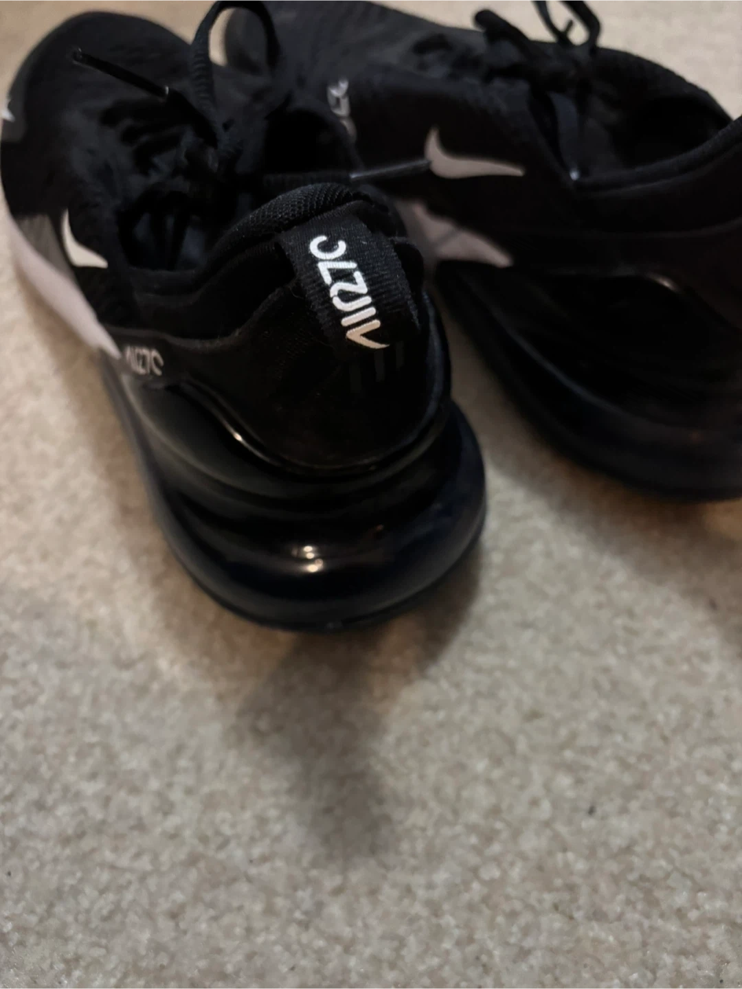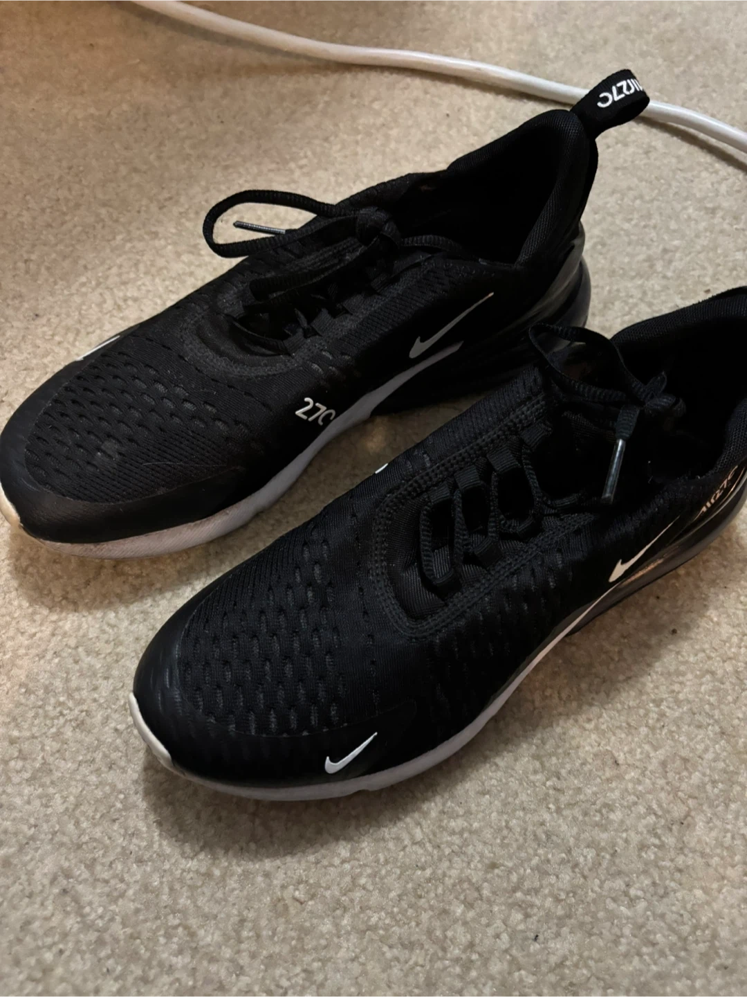 Selling a pair of Nike Air Max 270 sneakers in black! They are in US size 9. The shoes have a sleek design with the '270' branding. Great for everyday wear or workouts!