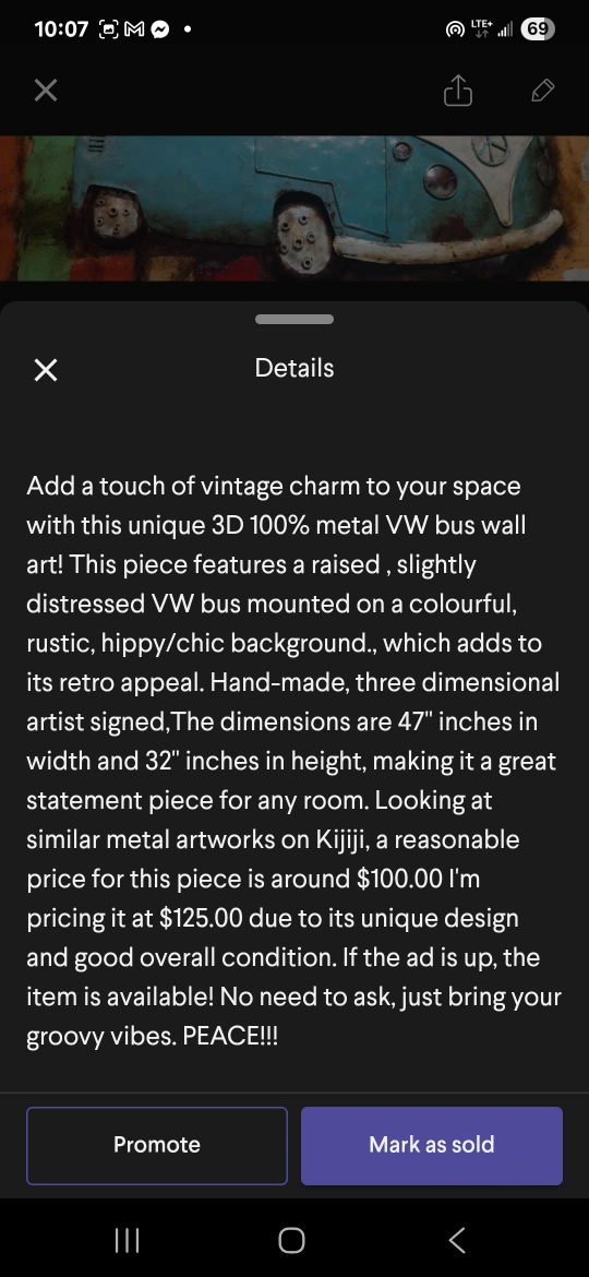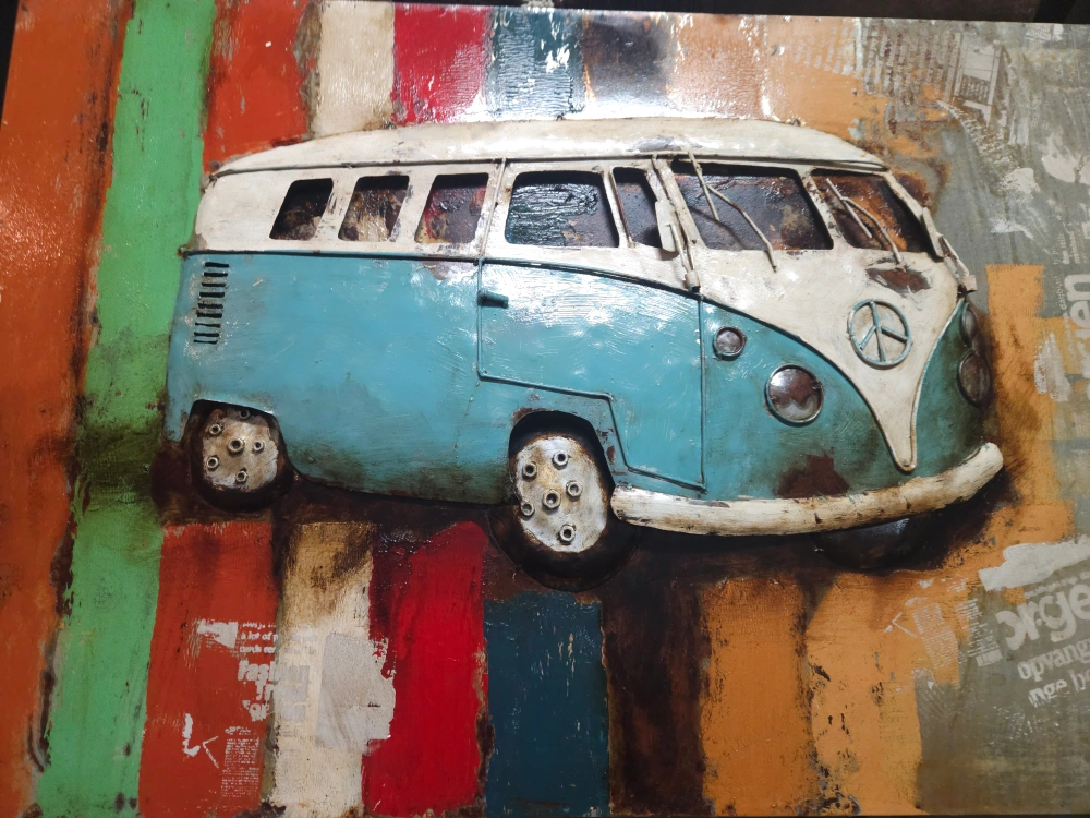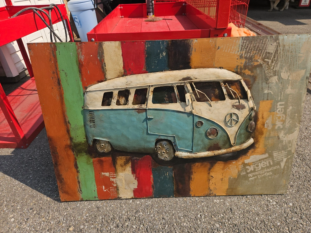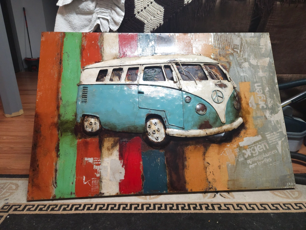 25Add a touch of vintage charm to your space with this unique 3D 100% metal VW bus wall art! This piece features a raised, slightly distressed VW bus mounted on a colourful, rustic, hippy/chic background, which adds to its retro appeal. Hand-made, three dimensional artist signed. The dimensions are 47" inches in width and 32" inches in height, making it a great statement piece for any room. I'm pricing it at $125.00 due to its unique design and good overall condition