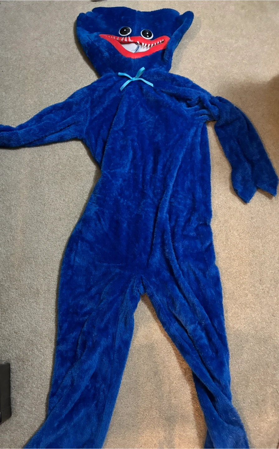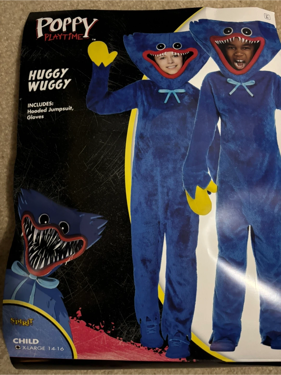 Selling a Poppy Playtime Huggy Wuggy costume in child size XL (14-16)! This costume includes a hooded jumpsuit and gloves. It's perfect for Halloween or dress-up play!