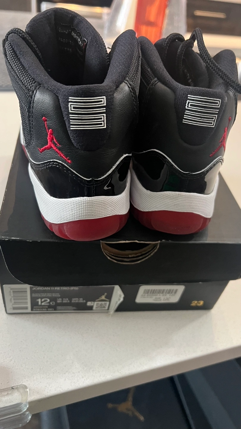 These Jordan 11 Retro Little Flex toddler shoes are in great condition and ready for a new home! They come in size 12 (US). The classic black, white, and red colourway looks great on little feet. Comes with the original box too!