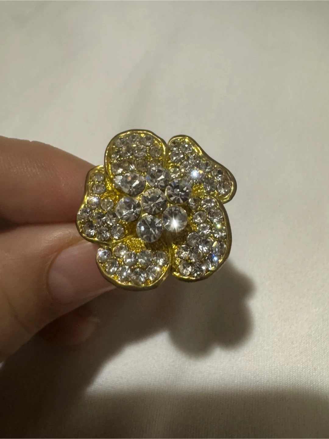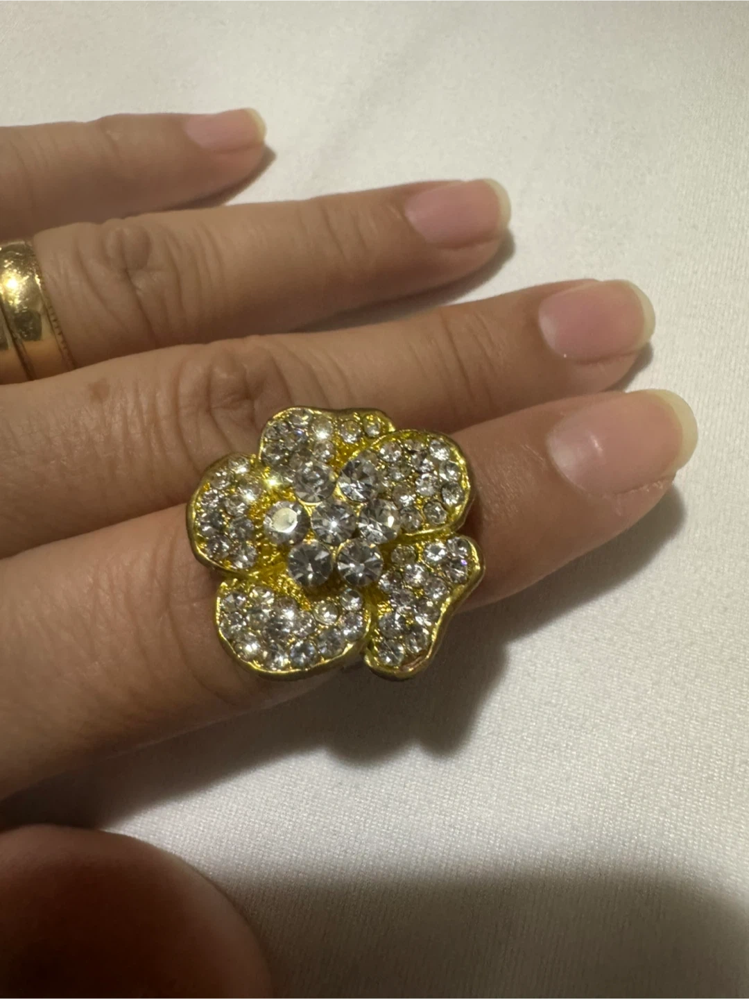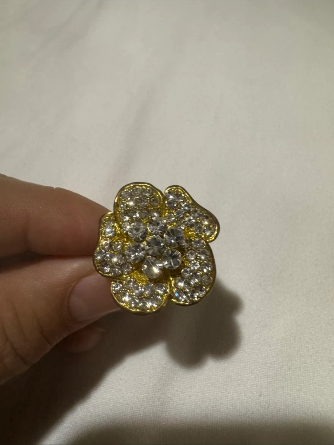 A beautiful flower ring with a gold tone finish and sparkling rhinestones! This adjustable ring adds a touch of elegance to any outfit. Perfect for adding a bit of sparkle to your day! Cash Pick up near Lawrence and Keele