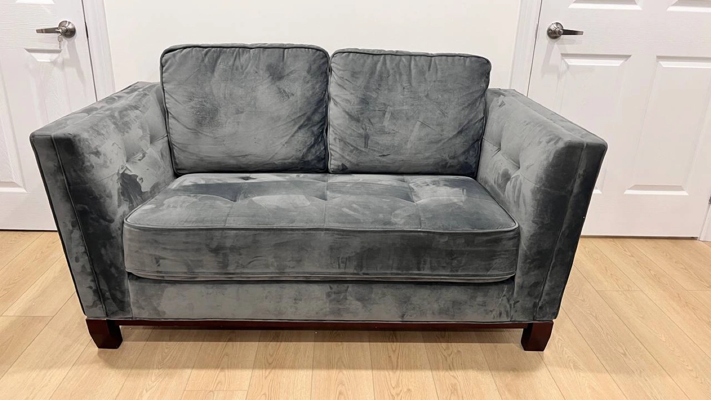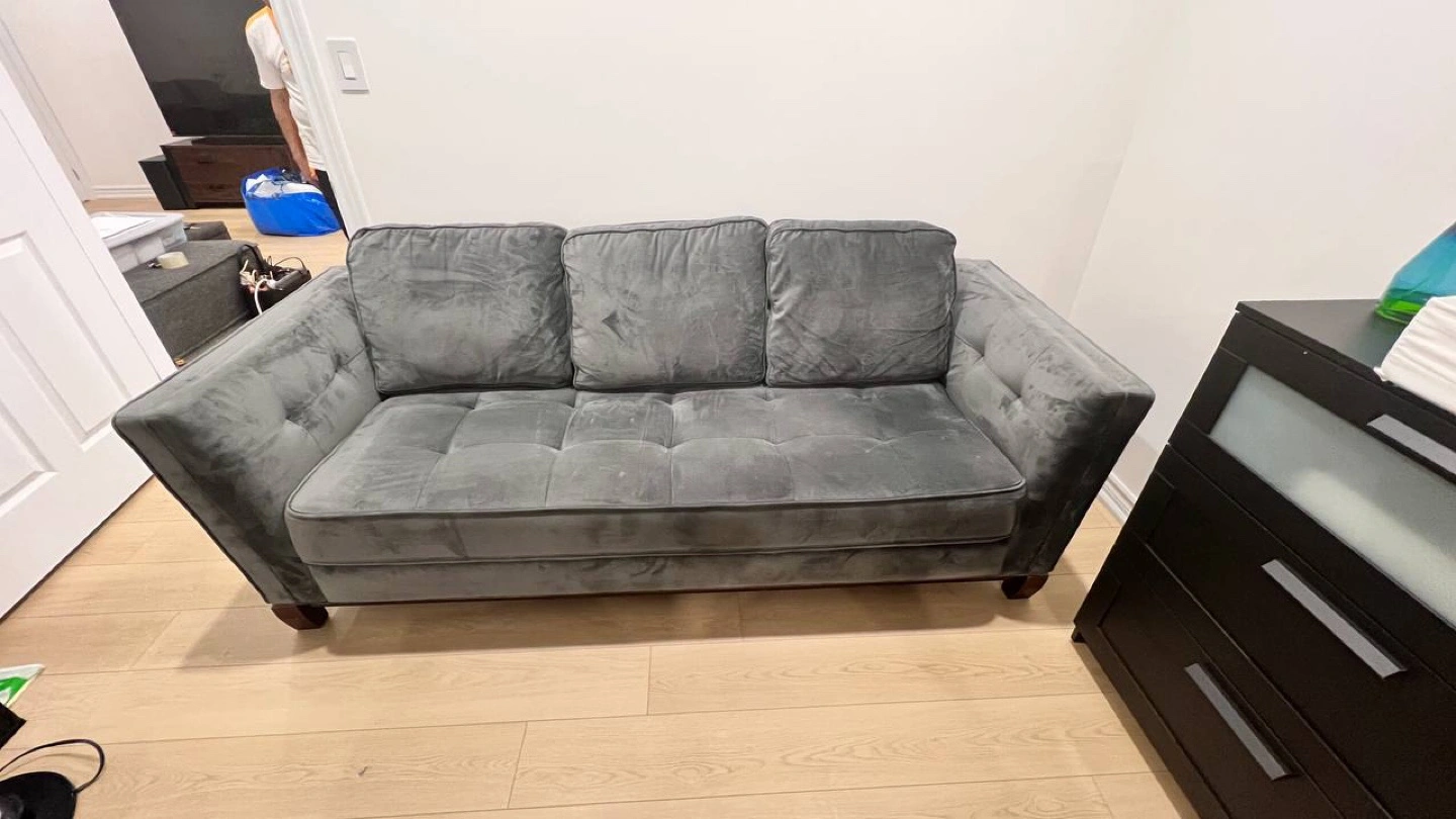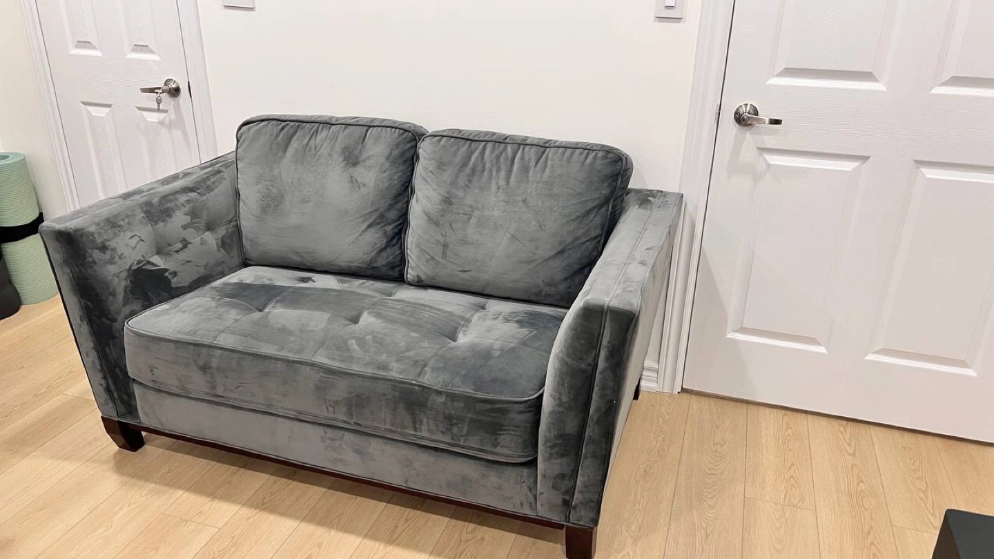 Transform your living space with this stylish and comfortable 5-piece sofa set from The Brick. ✨ Modern design with soft velvet fabric ✨ Sturdy wooden legs ✨ Includes loveseat and sofa (5 seats total) 🔹 Condition: Gently used, excellent quality 🔹 Perfect for any modern home