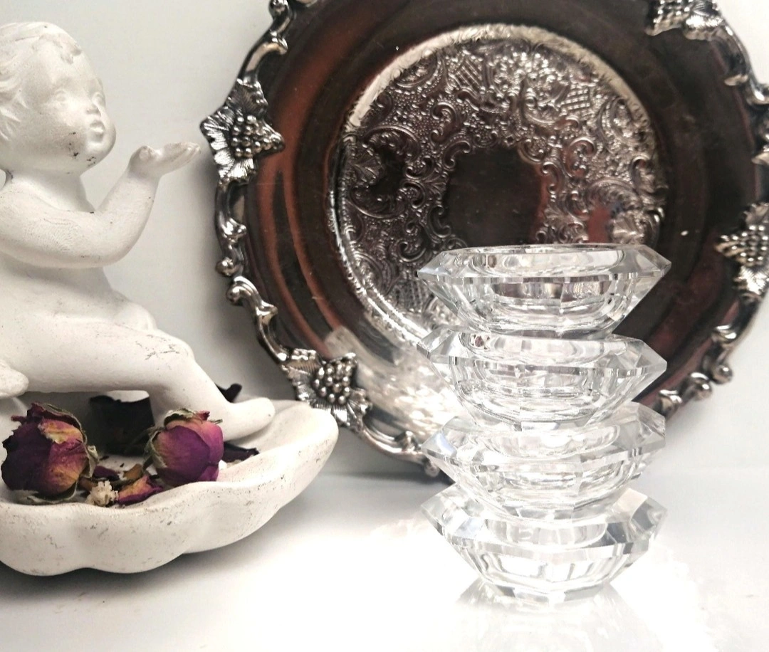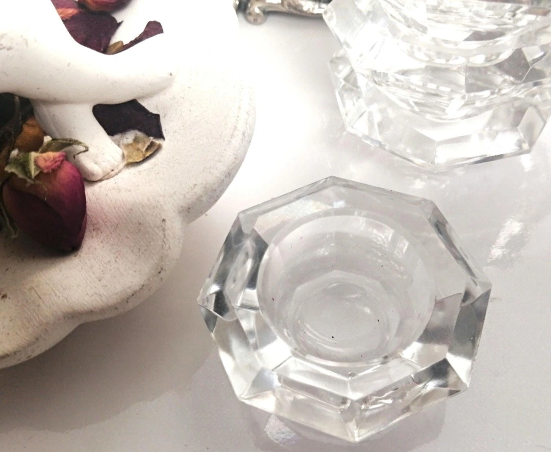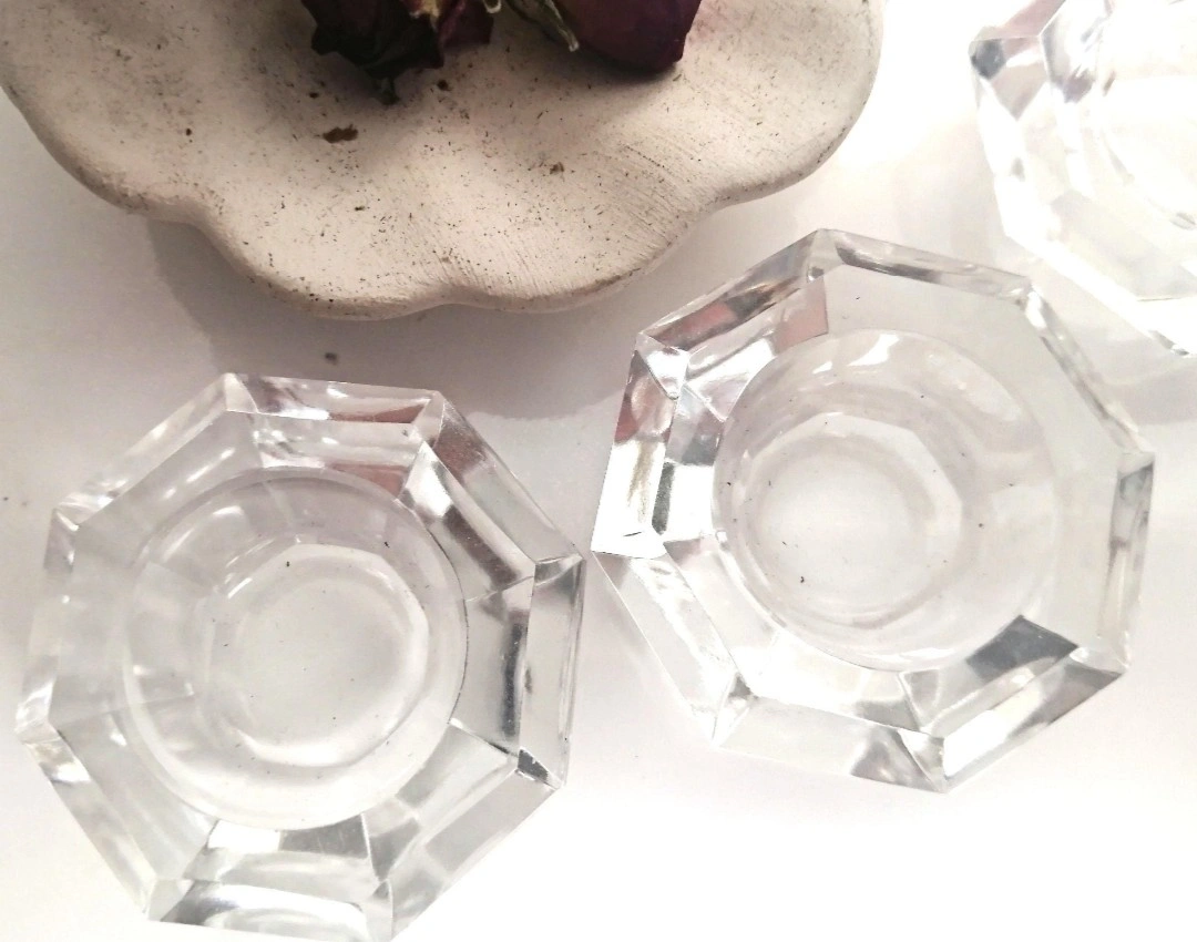 Set of four sparkling crystal candle holders. Octagon shape. Each measure approximately 2 inches (5 cm) in diameter. Simple and elegant. Good vintage condition. No chips or cracks.