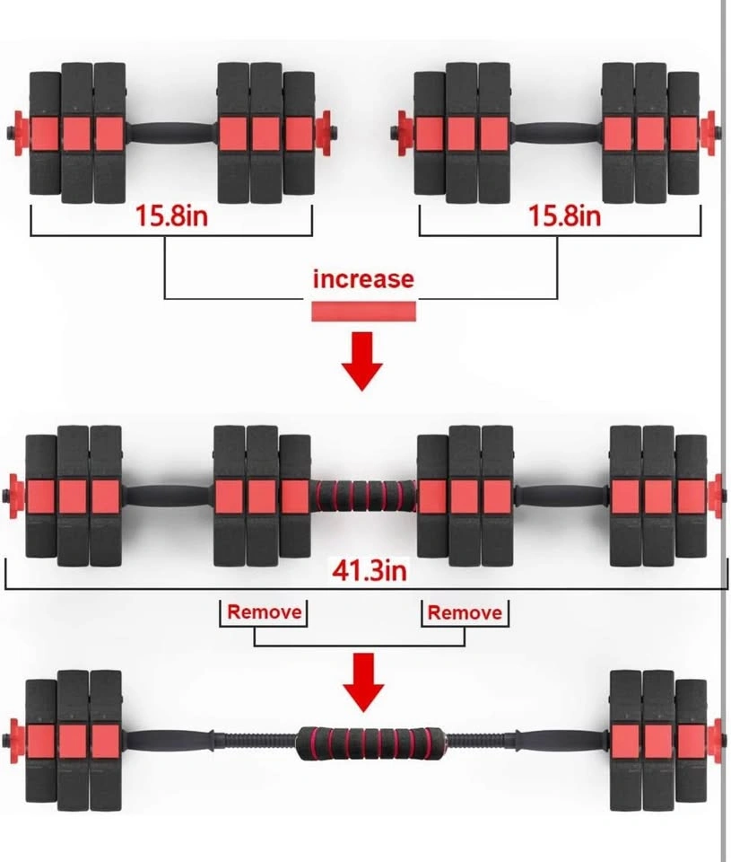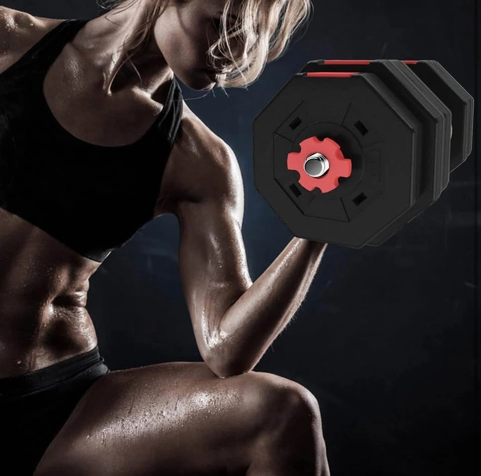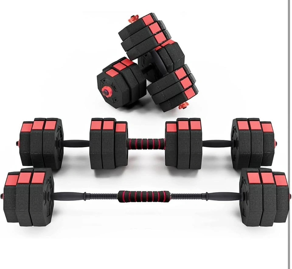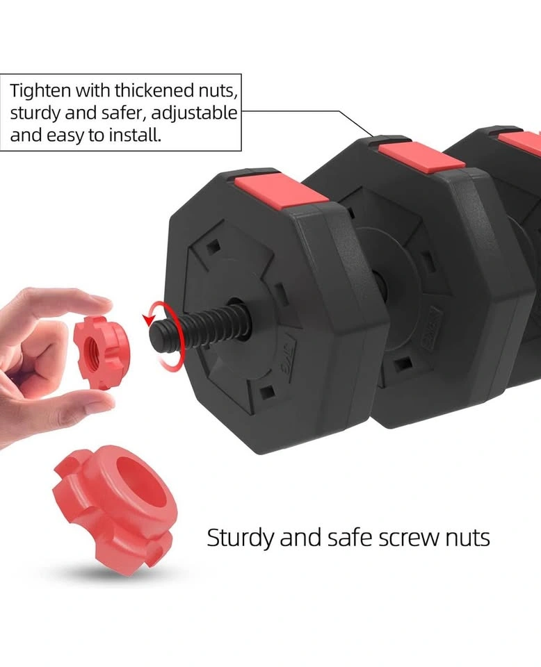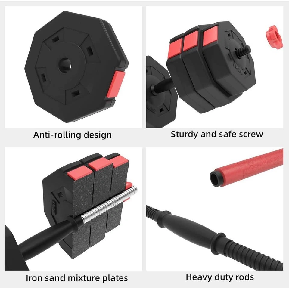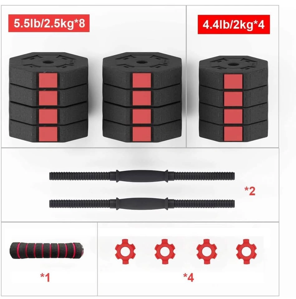 Adjustable Dumbbells Set, 3 in 1 Dumbbells Pairs, with Connecting Rod Convert to Barbells, Anti-Rolling Octagonal Design, Iron Sand Mixture, Adjustable Weight Sets Adjustable Weight Dumbbells Set: 66 pounds for two dumbbells (33 pounds each), comes in one package, with four 4.4-pound plates, eight 5.5-pound plates. Four pcs of screw collars. Two black main rods (17.3" long) and one red connecting rod (4.3" long). High-quality Material: Iron sand mixture for plates, PE material covered the surface; Hollow steel for main rod, ensure your safety in fitness and provide long time usage. 3-in-1 Adjustable Design: This adjustable dumbbell set comes with a connecting bar that can be easily attached to both dumbbells to transform into a barbell. Various weights and secure screw collars let you adjust the weight and try different combinations. Ideal for a total body workout, this dumbbell weight set is perfect for both upper and lower body building exercises. Anti Rolling Design: Octagonal-shaped dumbbells plates, anti rolling and prevent your floor from scratching. Non-slip grips create a comfortable handle that helps prevent your palms from blistering. Easy use and storage: Compact size, easy to adjust weight by assembling or remove plates. Pickup in AJAX