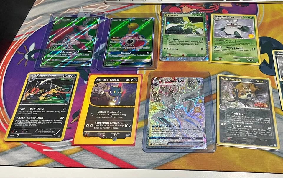 All near mint unless otherwise indicated $190 for all or individually priced below Lurantis GX 138/149 $3 Shuckle GX 195/214 $20 Scyther ex 102/109 DMG SOLD Abomasnow 19/123 $75 Houndoom 56/101 LP $8 Rockets sneasel 5 $14 Grimmsnarl vmax sv117/122 $5 Dark raticate 17/109 MP $30 No trades Minimum $10 purchase for meetup