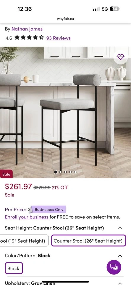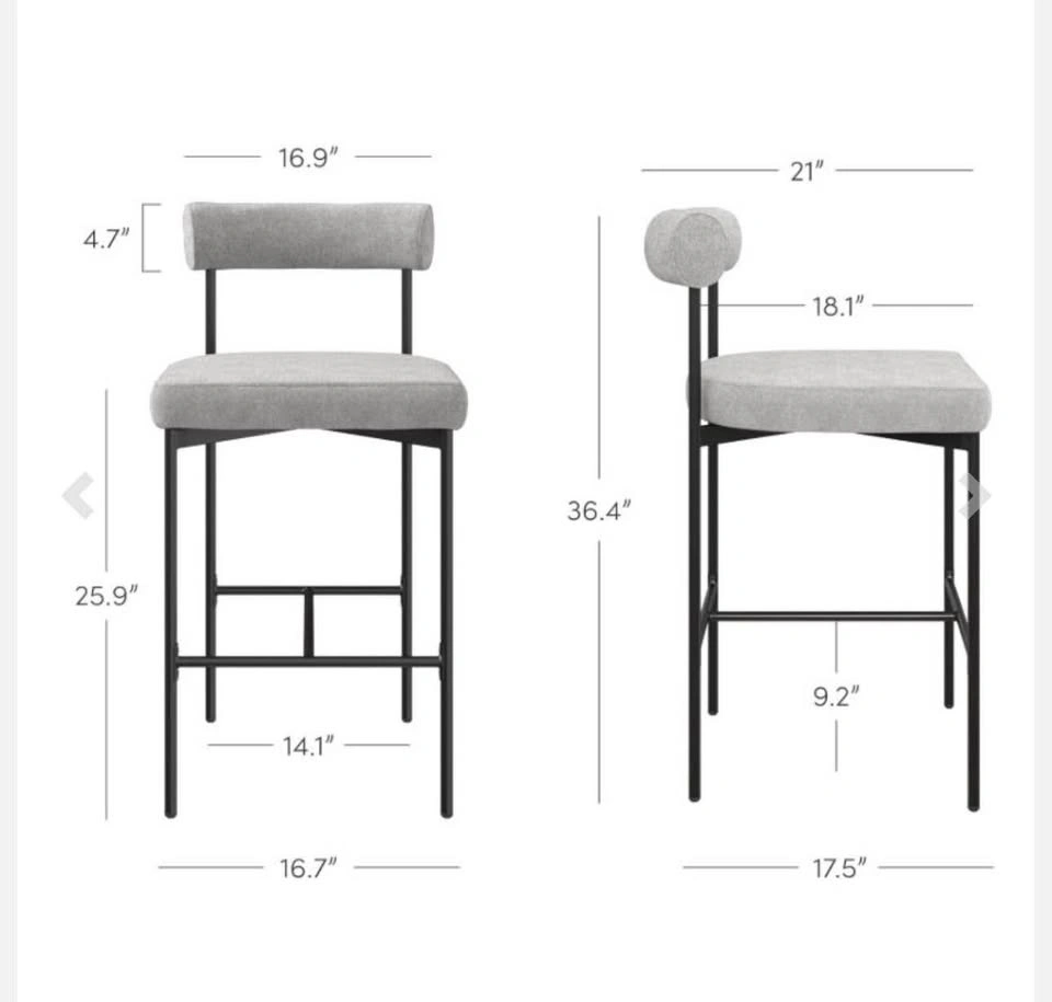 Modern Counter Stools – Set of 2 (Gray Linen, 26” Seat Height) Stylish and comfortable Nathan James counter stools in Gray Linen upholstery with a sleek black frame. Perfect for kitchens, islands, or bar areas, these stools combine modern design with everyday comfort. • Seat Height: 26” (Counter Height) • Color/Pattern: Gray Linen with Black Frame • Condition: Brand New in box • Retail Price: $261.97 each (Wayfair price) • My Price: Selling 2 stools for $230 total 📍 Pickup available in Vaughan or Midtown Toronto. Message me for any questions!
