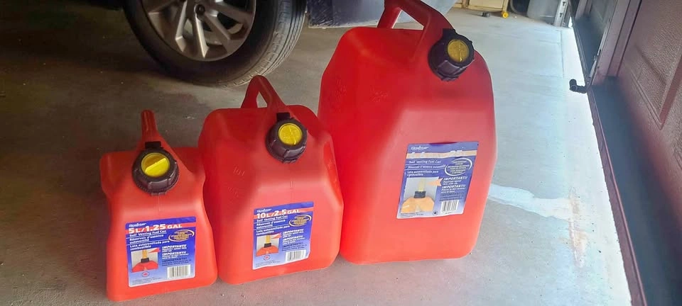 3 Scepter fuel cans, 3 sizes 5, 10 and 25L. Self venting, no leaks!