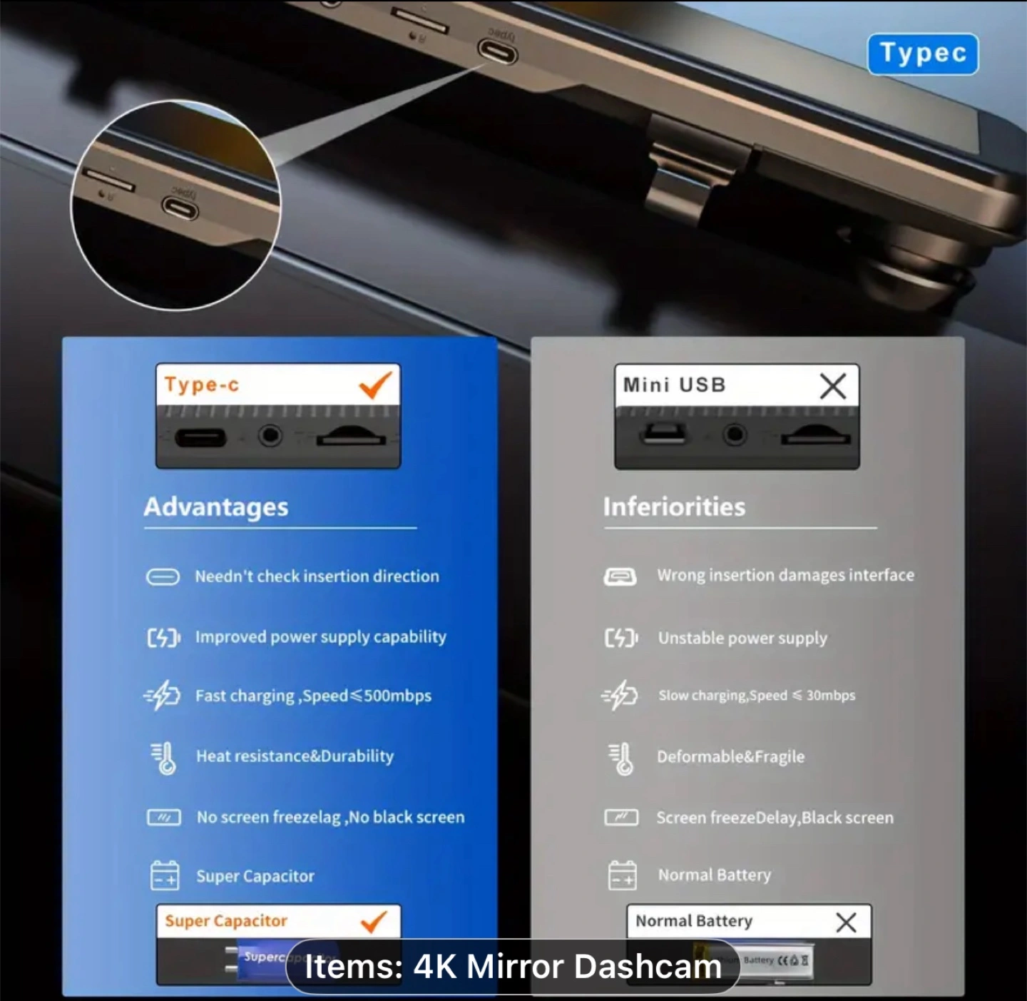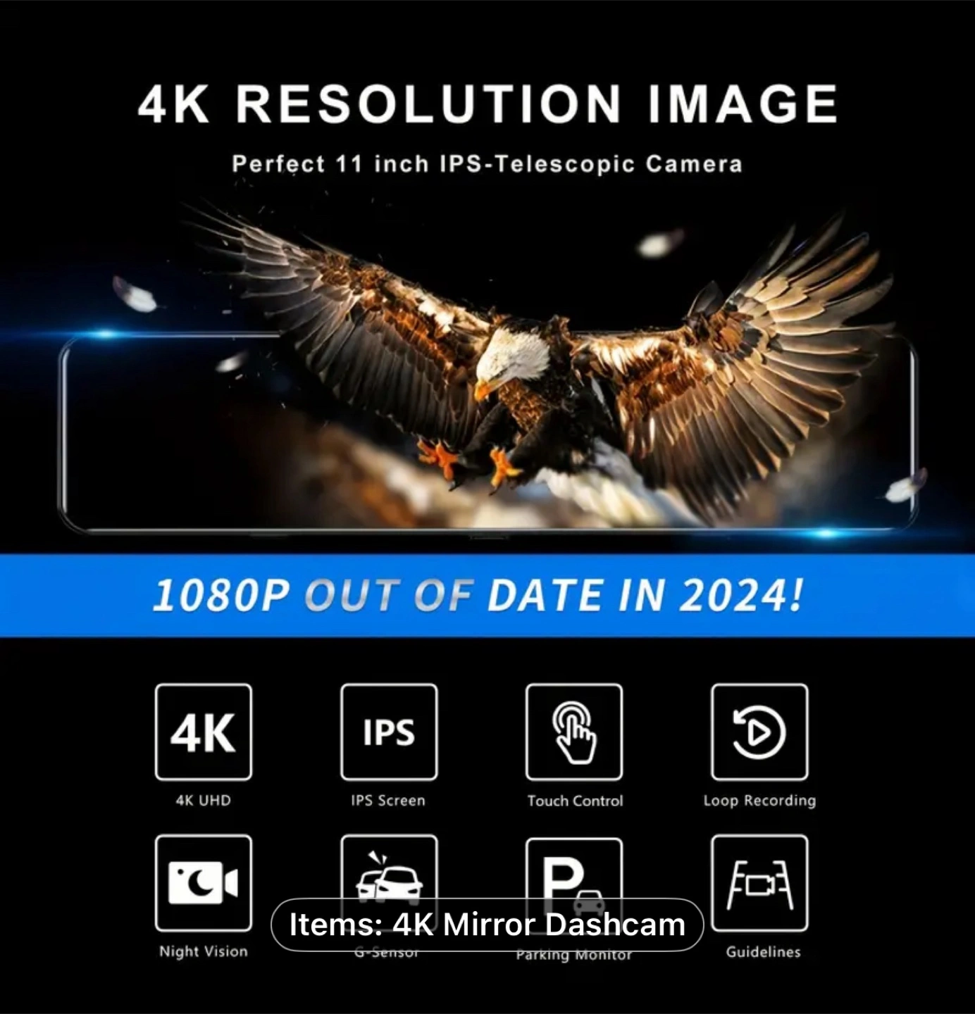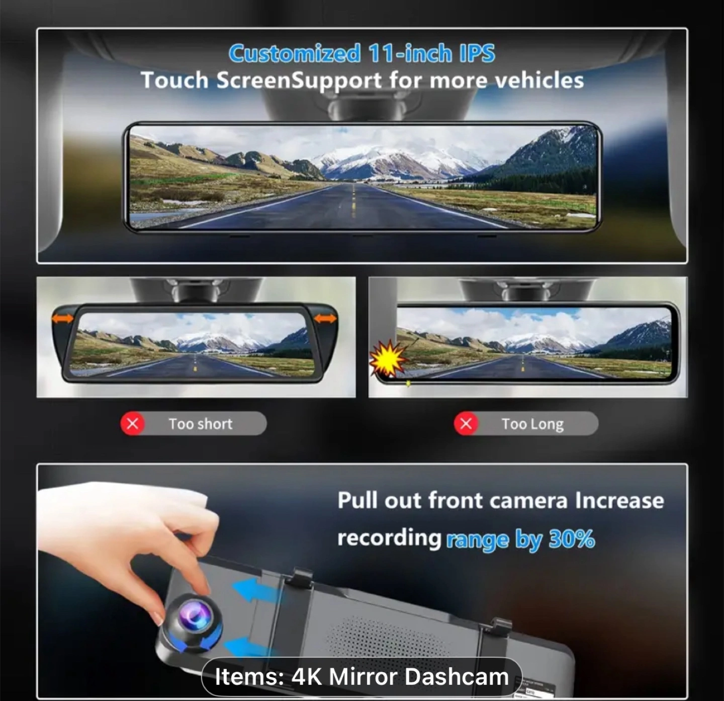 4K Mirror Dash Cam Front And Rear, Rearview Mirror Camera For Cars & Trucks With 11" IPS Touch Screen, Backup Camera With Type-C, Starvis Sensor. Cash only please [LOOK AT ME!!!] The rear camera cable length provided in our original package is about 19ft. It is suitable for the vast majority of cars. If it is too short for your vehicle model, please click on the store name (highlighted) below the product title to enter the store and select the appropriate 10 meter (33ft) rear camera extension cable based on the product model you purchased. If you have any questions, please contact Customer Service Support in the USER MANUAL. [ Why We Use Type-C? ] We complete the upgrade of the Type-C interface designed for dash cams. This new version is ultra-thin but with more funct-ions. For example, it boasts 24 built-in pins, supports USB3.1 high-speed transmission and can be plugged and unplugged for at least 10,000 times. Compared with the traditional mini-USB interface with 5 pins, it avoids the problems that are likel-y to occur when in use, including black screen, restart, deformation caused by high temperature and so on. [ Why We Choose 4K? ] Can your dash cam clearly capture the license plate numbers of other vehicles in front or behind at night? If not, you need the 4K Dash Cam. It owns a real 4K resolution, so it can record high-definition and smooth images no matter it is in daylight or at night, rainy or sunny. In a word, this 4K Dash Cam is an indispensable helper for you. A touch screen with a full 11-inch IPS display This streaming media dash cam adopts 11" IPS full touch screen with 1920*480 resolution. The user-friendly Ul interface will make your operation easier and more convenient. Higher resolution can restore the true color of objects to the greatest extent, provide perfect night scene pictures, and make the presentation of details such as license plate numbers and road signs more clearly. Unlike the usual reverse assist system that displays a 72-degree field of view, the rearview mirror recorder can display a 180-degree field of view, so the rear view will be much larger.